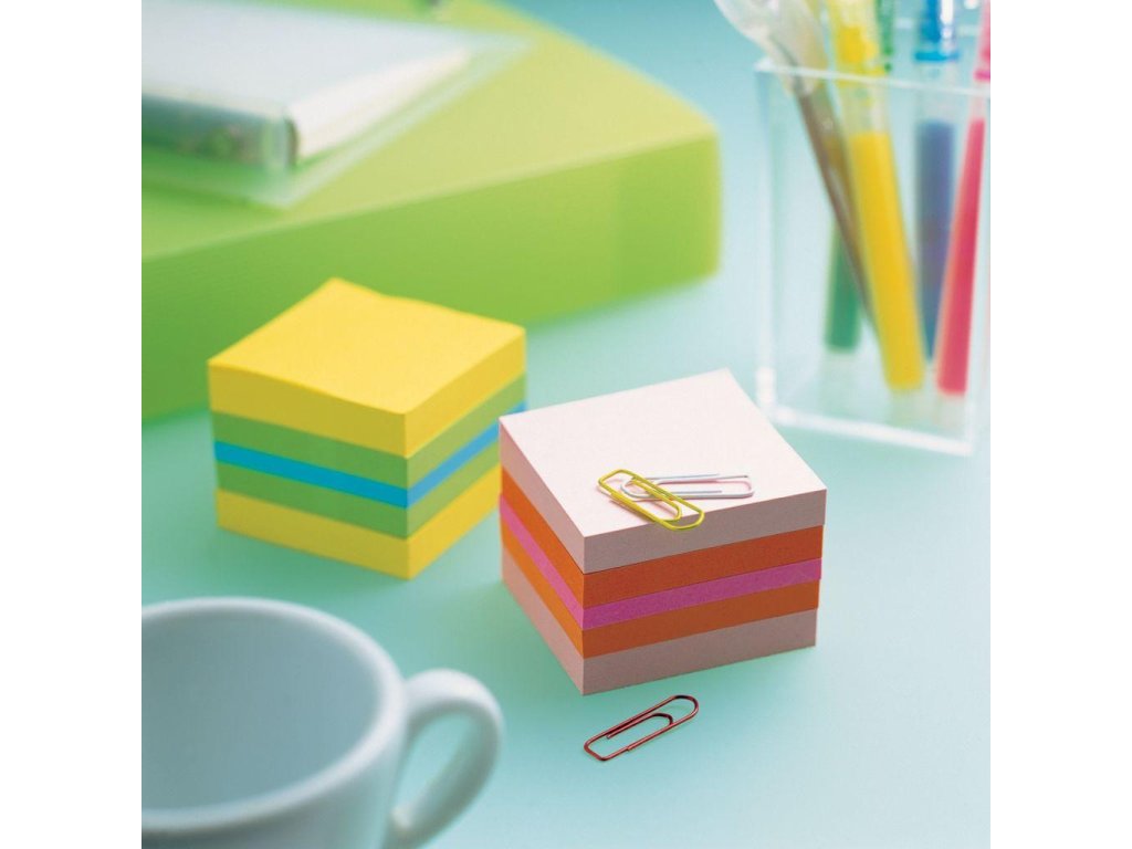 Malé samolepiace lístky v tvare kocky, 400 lístkové, v 3 farbách: neónová žltá (2 × 100 lístkov), ultramodrá (50 lístkov), ultrazelená (2 × 75 lístkov).