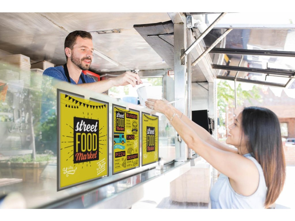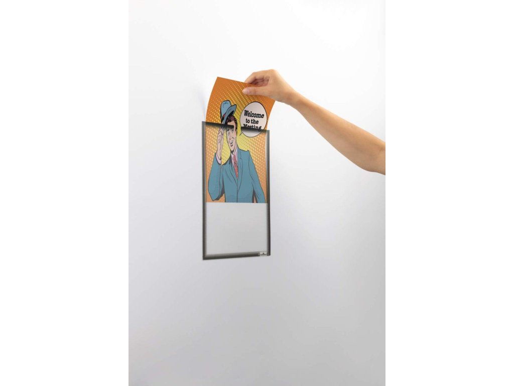 Držiak na dokumenty vo formáte A4 na pripevnenie pomocou troch lepiacich pásikov. Výrez na vkladanie a vyberanie dokumentov.