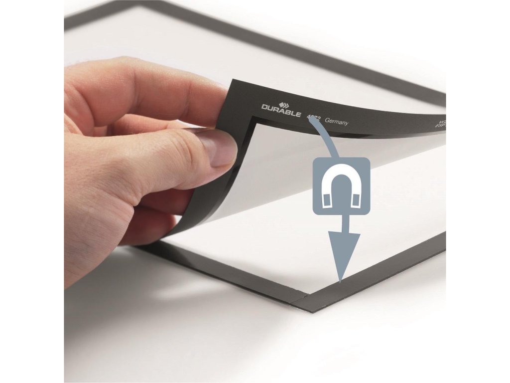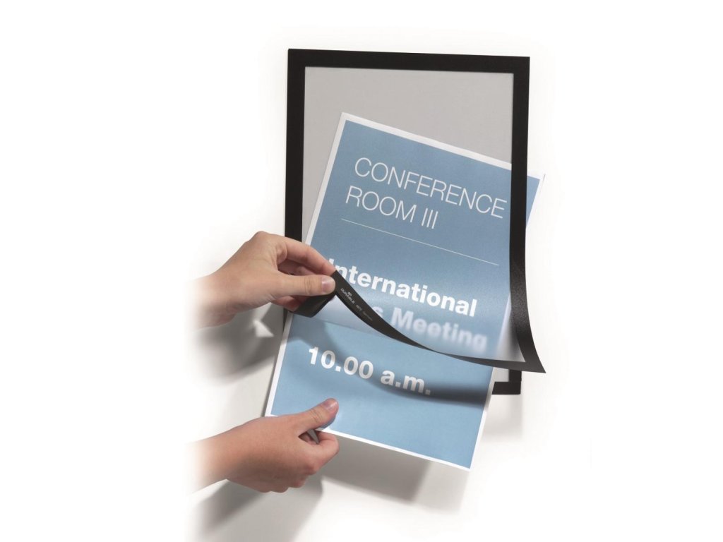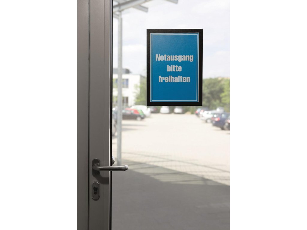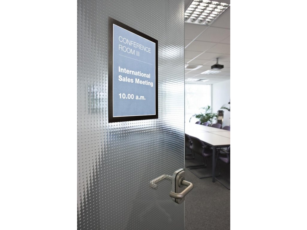 Samolepiaci informačný panel s prednou magnetickou časťou. Ideálny na vystavovanie plagátov, kľúčových informácií, špeciálnych oznamov alebo dôležitých čísel. Informácie sa ľahko vymieňajú a sú čitateľné z oboch strán, ak sa panel umiestni napr. na okno alebo priehľadné dvere. Vhodný na hladké a pevné povrchy. V prípade potreby je ľahko premiestniteľný bez potreby vŕtania. Formát A4, rámik čierny.
