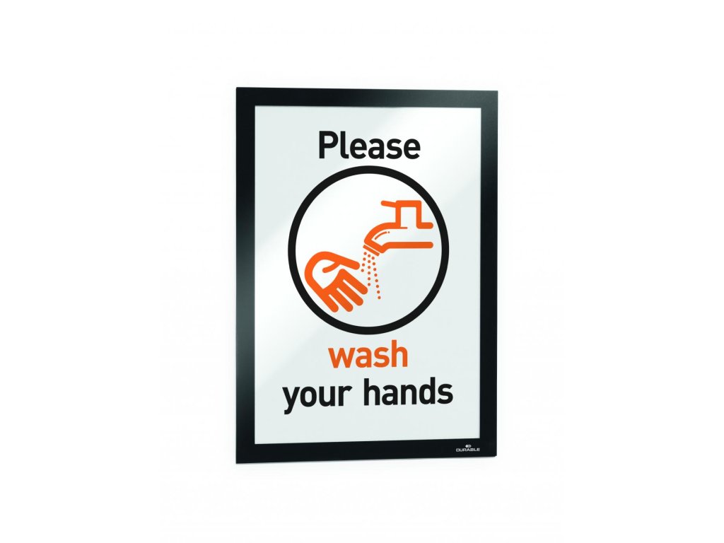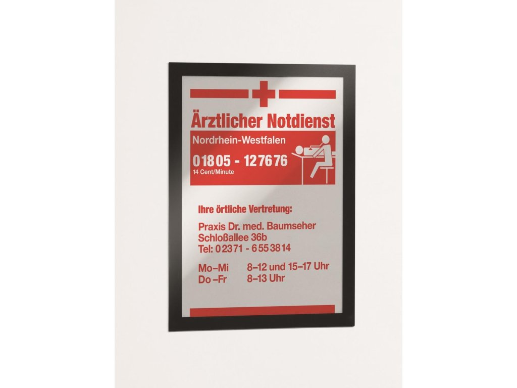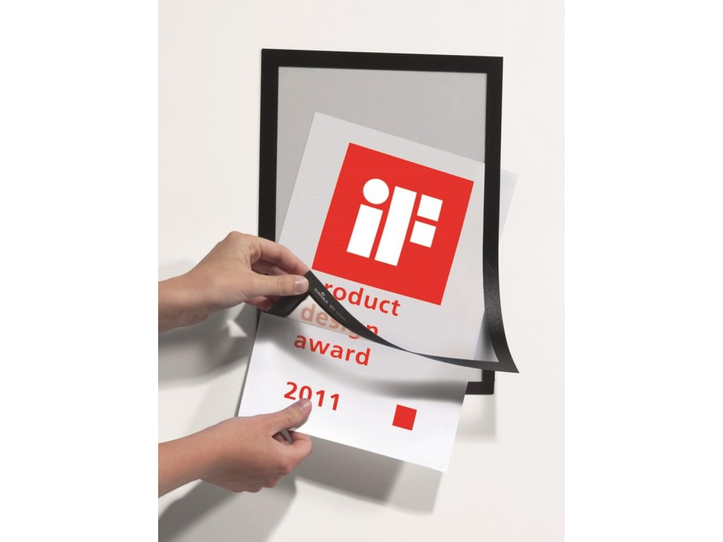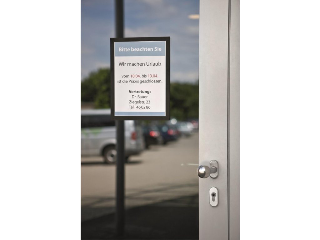 Samolepiaci informačný panel s prednou magnetickou časťou. Ideálny na vystavovanie plagátov, kľúčových informácií, špeciálnych oznamov alebo dôležitých čísel. Informácie sa ľahko vymieňajú a sú čitateľné z oboch strán, ak sa panel umiestni napr. na okno alebo priehľadné dvere. Vhodný na hladké a pevné povrchy. V prípade potreby je ľahko premiestniteľný bez potreby vŕtania. Formát A4, rámik čierny.