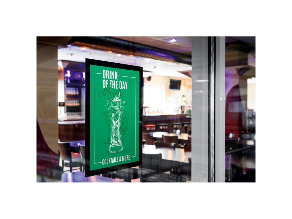 Informačný panel so statickým priľnutím pre použitie na okná, vystavené priamemu slnečnému žiareniu. S ochranou voči UV žiareniu. Odoláva teplotám až do 70 °C. V prípade potreby je ľahko premiestniteľný.
