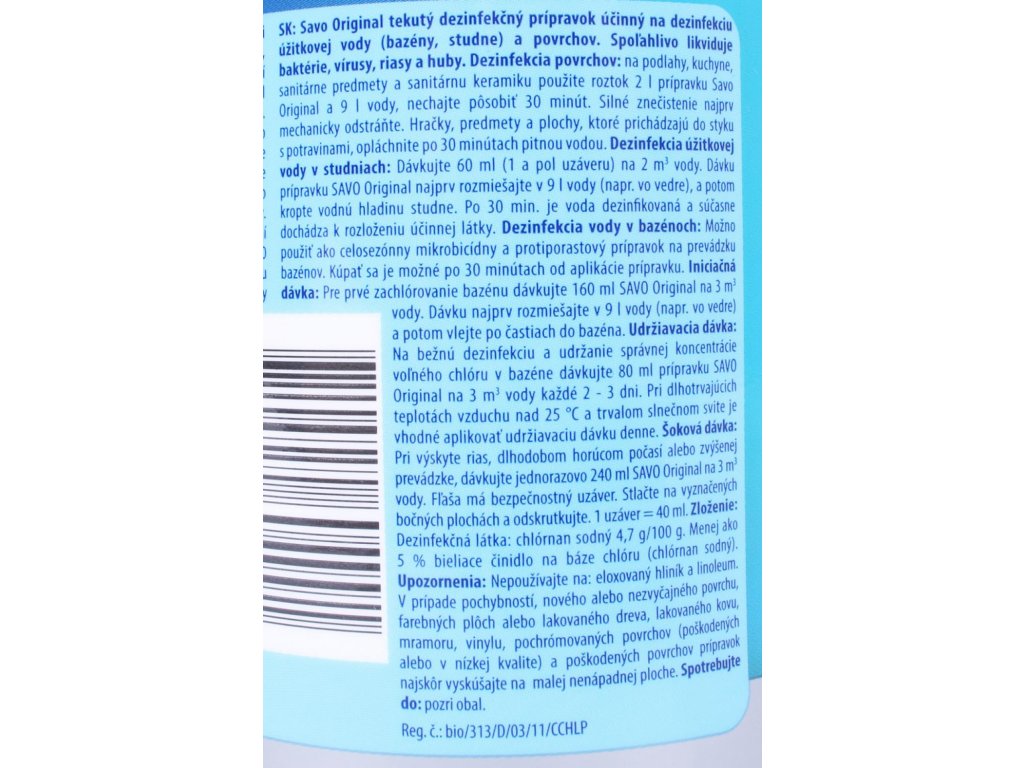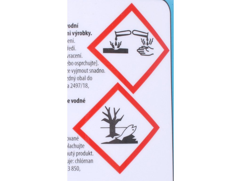 Spôsobuje vážne poleptanie kože a poškodenie očí. Veľmi toxický pre vodné organizmy. Toxický pre vodné organizmy, s dlhodobými účinkami. Môže byť korozívna pre kovy. Pozor! Nepoužívajte spolu s inými výrobkami. Môžu sa uvoľňovať nebezpečné plyny (chlór). Uchovávajte mimo dosahu detí. Uchovávajte iba v pôvodnom balení. Noste ochranné rukavice/ ochranný odev/ ochranné okuliare/ ochranu tváre. Zabráňte uvoľneniu do životného prostredia.