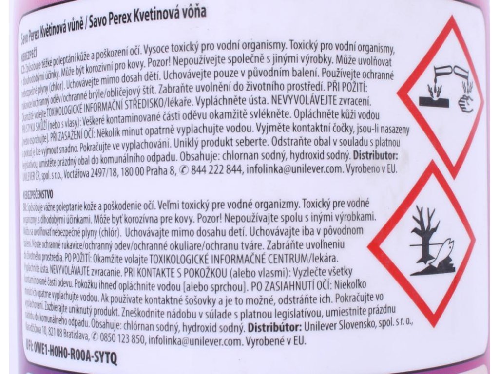 SK: Spôsobuje vážne poleptanie kože a poškodenie očí. Veľmi toxický pre vodné organizmy. Toxický pre vodné organizmy, s dlhodobými účinkami. Môže byť korozívna pre kovy. Pozor! Nepoužívajte spolu s inými výrobkami. Môžu sa uvoľňovať nebezpečné plyny (chlór). Uchovávajte mimo dosahu detí. Uchovávajte iba v pôvodnom balení. Noste ochranné rukavice/ochranný odev/ ochranné okuliare/ ochranu tváre. Zabráňte uvoľneniu do životného prostredia. PO POŽITÍ: Okamžite volajte TOXIKOLOGICKÉ INFORMAČNÉ CENTRUM/ lekára. Vypláchnite ústa. NEVYVOLÁVAJTE zvracanie. PRI KONTAKTE S POKOŽKOU (alebo vlasmi): Vyzlečte všetky kontaminované časti odevu. Pokožku ihneď opláchnite vodou (alebo sprchou). PO ZASIAHNUTÍ OČÍ: Niekoľko minút ich opatrne vyplachujte vodou. Ak používate kontaktné šošovky a je to možné, odstráňte ich. Pokračujte vo vyplachovaní. Zozbierajte uniknutý produkt. Zneškodnite nádobu v súlade a platnou legislatívou, umiestnite prázdnu nádobu do komunálneho odpadu. Obsahuje: chlórnan sodný, hydroxid sodný. Distribútor: Unilever Slovensko, spol. s.r.o., Karadžičova 10, 821 08 Bratislava, tel. č.: 0850 123 850, infolinka@unilever.com. Vyrobené v EU.