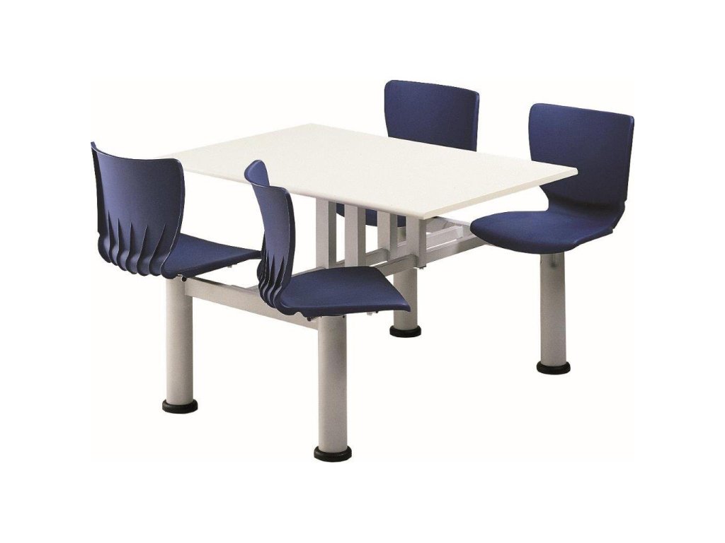 Jedálenský set do školskej alebo podnikovej jedálne, ktorý pozostáva z plastových stoličiek uchytených k rámu a dosky stola.