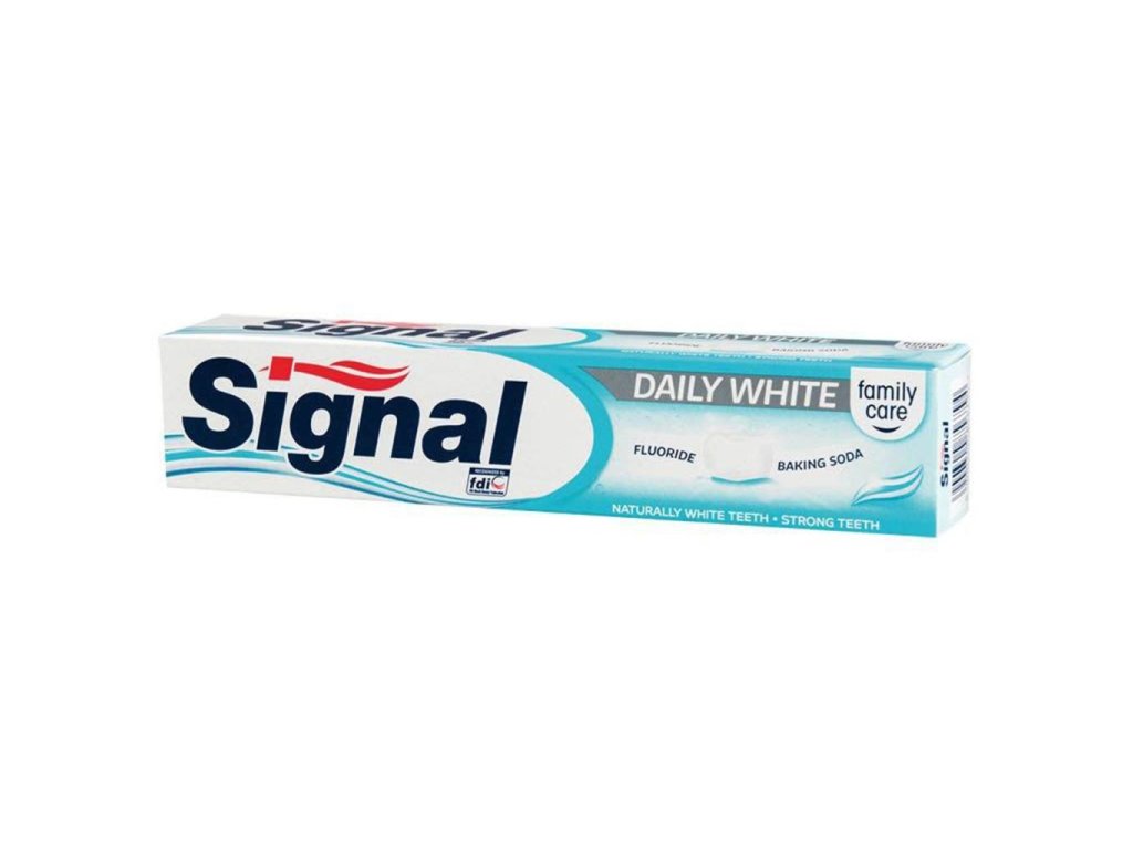 Zubná pasta Signal Daily white čistí a chráni zuby. Vďaka obsahu bikarbonátu sodného obnovuje prirodzenú belosť vašich zubov. Obsahuje fluorid, ktorý posilňuje zubnú sklovinu a ochraňuje ich pred vznikom zubného kazu. Čistite si zuby 2x denne po dobu 3 minút. Deti do 6 rokov len pod dohľadom dospelej osoby, hrozí prehltnutie. Objem balenia 75ml.