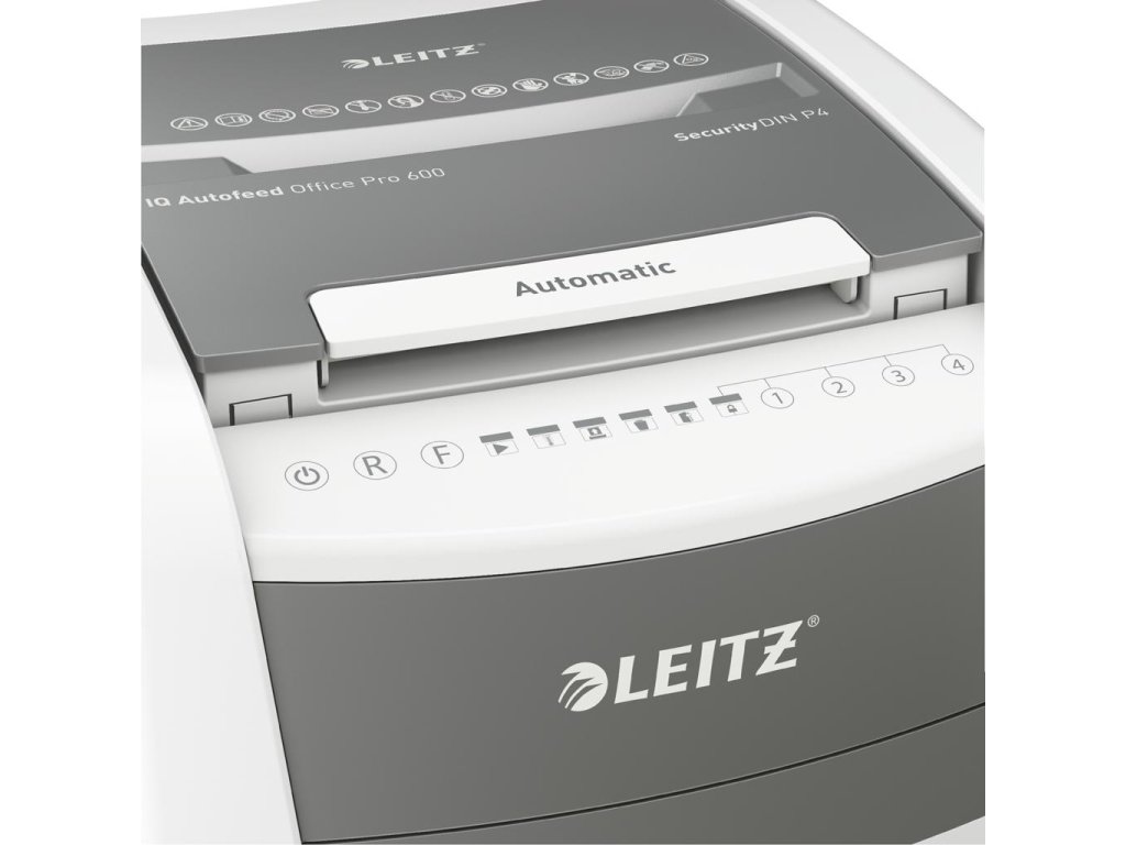 Plnoautomatická skartovačka na papier od firmy Leitz s jedinečnou čistou vyprázdňovacou funkciou. Je taká inteligentná, že potichu pracuje sama, len vložíte stoh papiera (vrátane kancelárskych sponiek a sponiek do zošívačky), zatvoríte veko a môžete ísť za svojou robotou. Ideálna na každodenné používanie v kancelárii. Dôveryhodná a vysokovýkonná skartovačka s funkciou proti zaseknutiu papiera, tichá a s prvotriedne dlhou dobou prevádzky (240 minút). Automaticky skartuje 600 hárkov A4 na úrovni zabezpečenia P-4 (4 × 28 mm) s krížovým rezom do veľkého 110l koša. Jednoduché ovládanie pomocou dotykových prvkov.