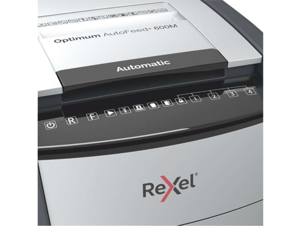 Skartovačka Optimum AutoFeed 600M automaticky skartuje až 600 hárkov papiera A4 (80 g/m2) mikrorezom P-5 (2 × 15 mm). Tento stroj na skartovanie s automatickým podávaním je sofistikovaný kancelársky drvič s výsuvným košom s objemom 110 l. Nie je potrebné ručne vkladať papier alebo vopred odstraňovať svorky a kancelárske sponky, táto automatická skartovačka papiera urobí všetko za vás.