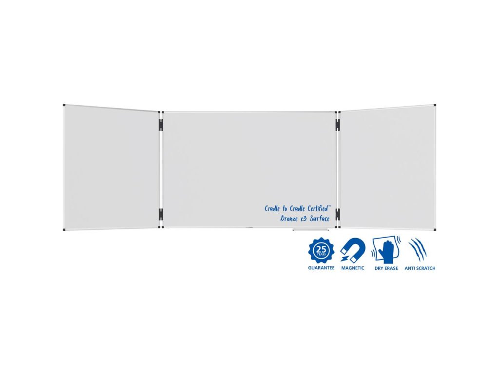 Rozkladacia hybridná magnetická tabuľa s dostatkom miesta na písanie, pripevňovanie poznámok a obrázkov v konferenčných miestnostiach alebo učebniach. Dve obojstranné výklopné krídla, ktoré možno zaaretovať pomocou klipov. Vhodné na písanie fixkami na tabuľu stierateľnými za sucha. Vrátane odkladacej lišty (30 cm), montážnej sady a montážneho návodu. Rozmer 100 x 150 cm.