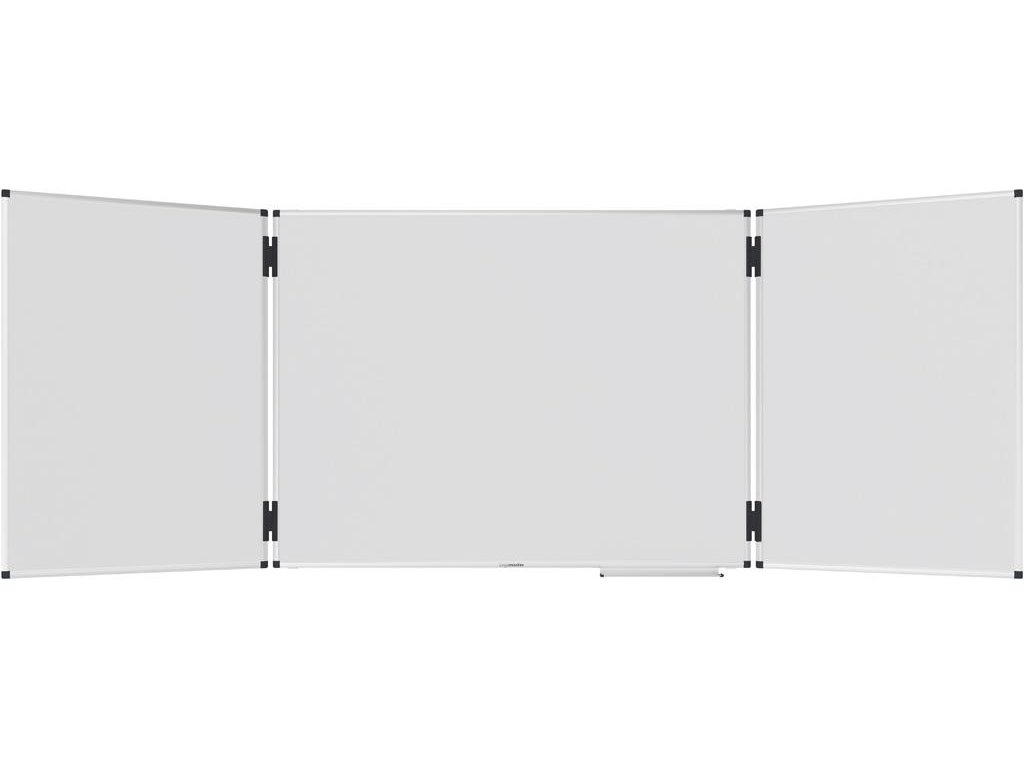 Rozkladacia hybridná magnetická tabuľa s dostatkom miesta na písanie, pripevňovanie poznámok a obrázkov v konferenčných miestnostiach alebo učebniach. Dve obojstranné výklopné krídla, ktoré možno zaaretovať pomocou klipov. Vhodné na písanie fixkami na tabuľu stierateľnými za sucha. Vrátane odkladacej lišty (30 cm), montážnej sady a montážneho návodu. Rozmer 90 x 120 cm.