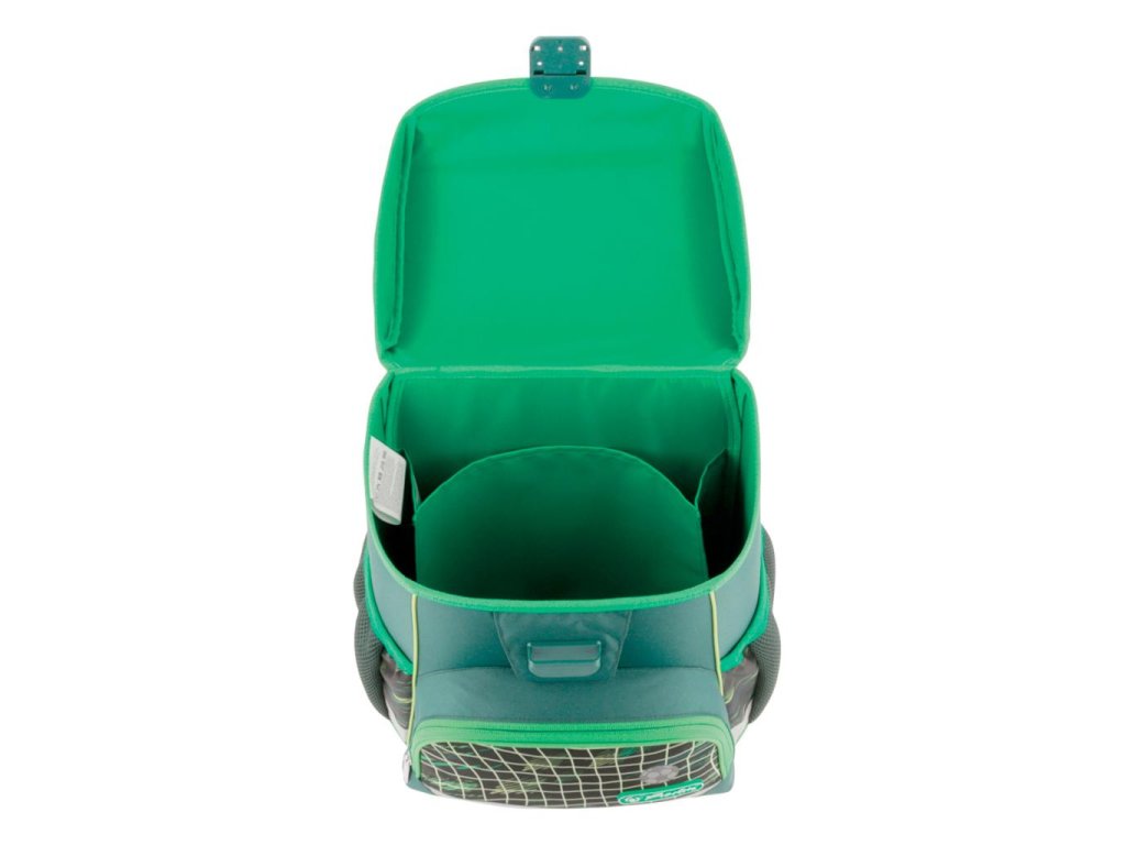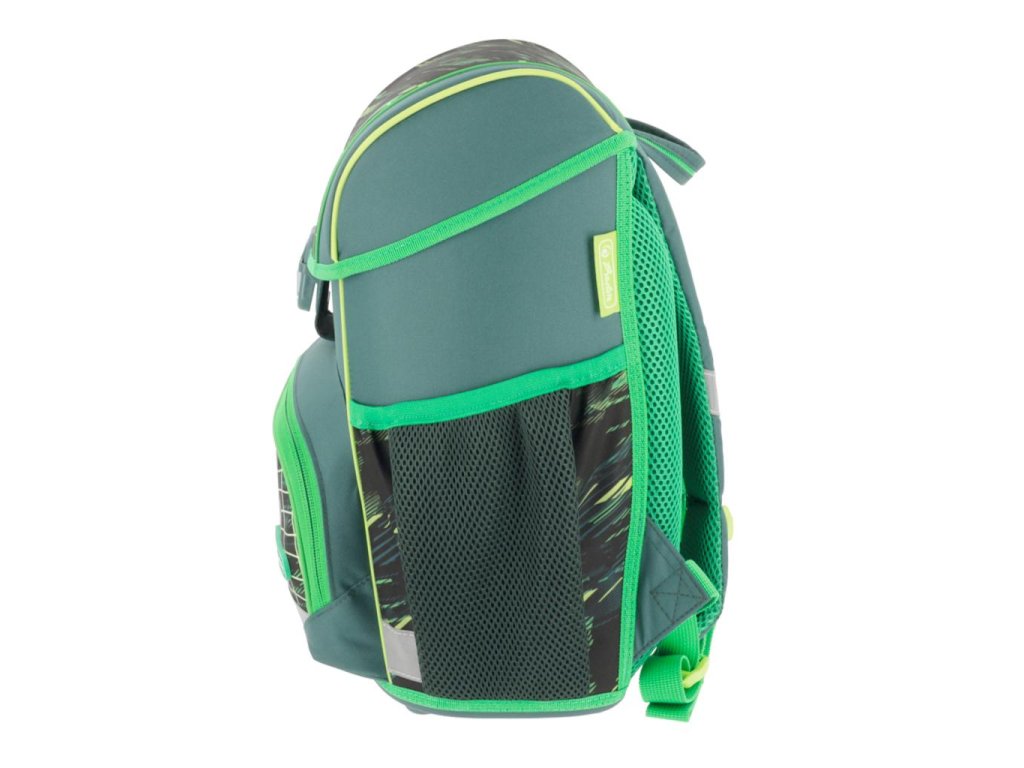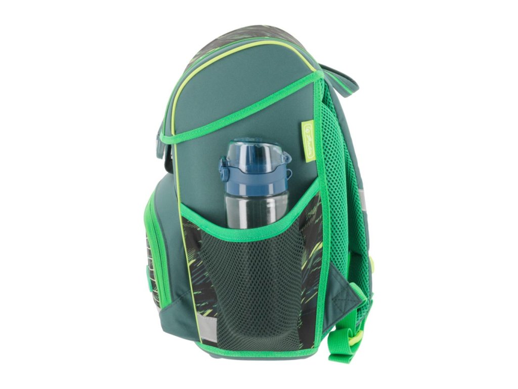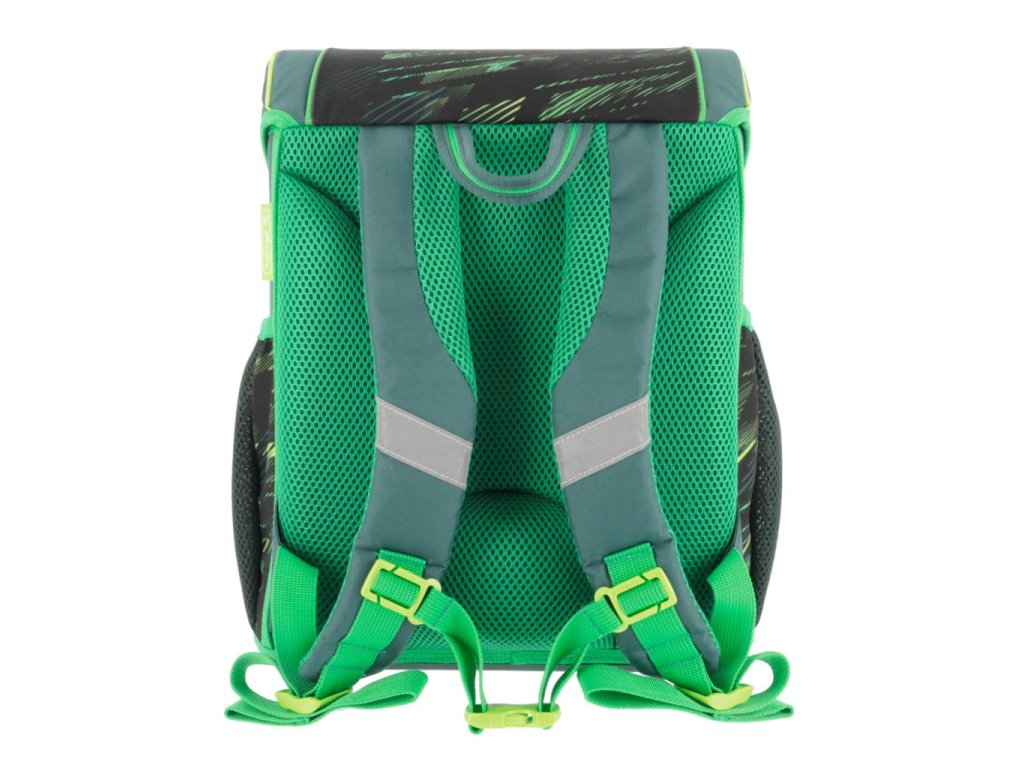 Školská taška s výbavou, ergonomicky tvarovaným a priedušným polstrovaním chrbta, nastaviteľnými ramennými popruhmi, výškovo nastaviteľným hrudným pásom, hlavným vreckom s priestorom na knihy, bočnými vreckami s elastickými pásikmi, predným vreckom na zips, stabilnou spodnou doskou s nožičkami, pohodlnou rukoväťou a reflexnými prvkami Oralite. Hmotnosť 950 g, objem 16 l, rozmery 37 x 31 x 22 cm. Vode-odolná, bez PVC, výbava: peračník, vrecko na prezuvky, okrúhle puzdro. Certifikát ergonómie 2023 a 2025. Materiál: Polyester.