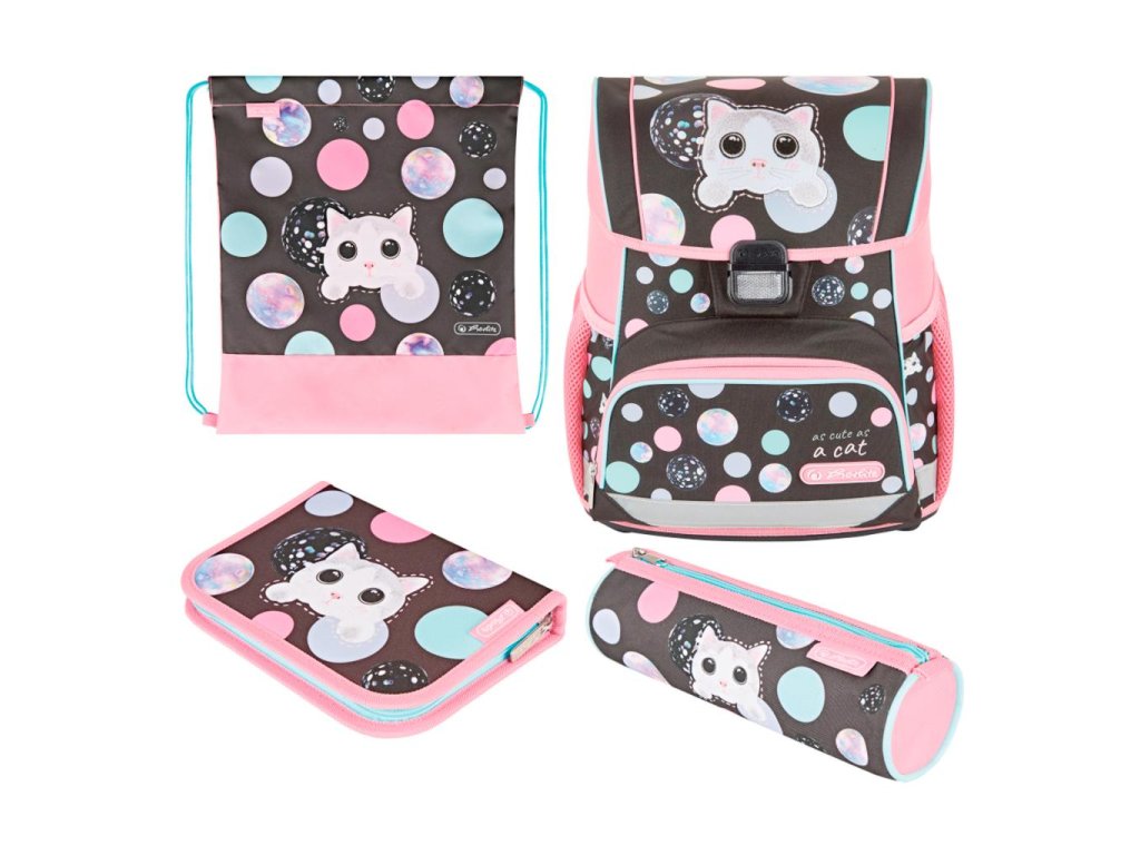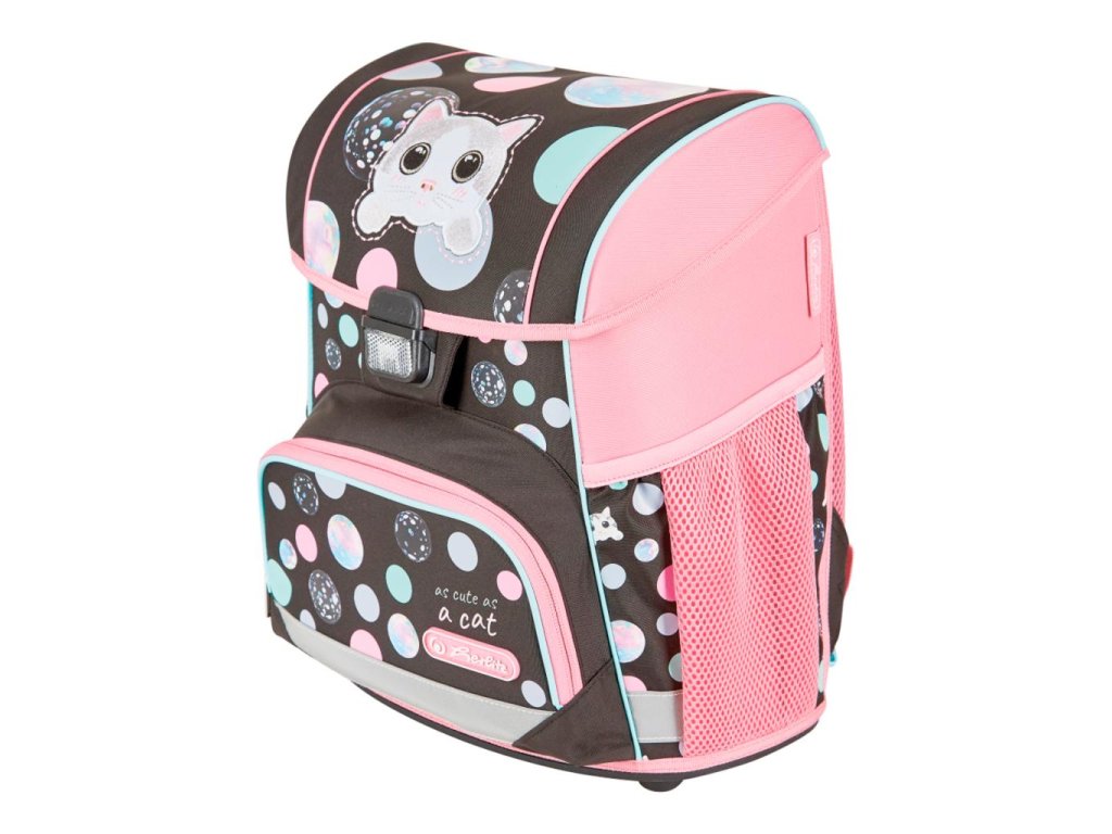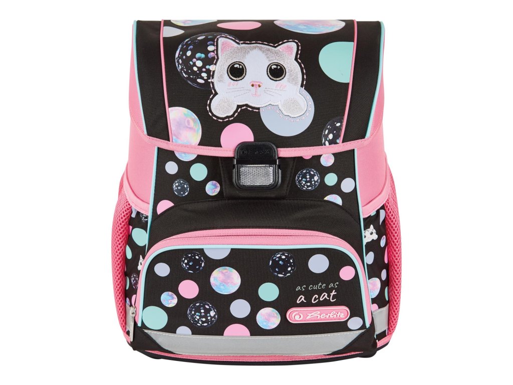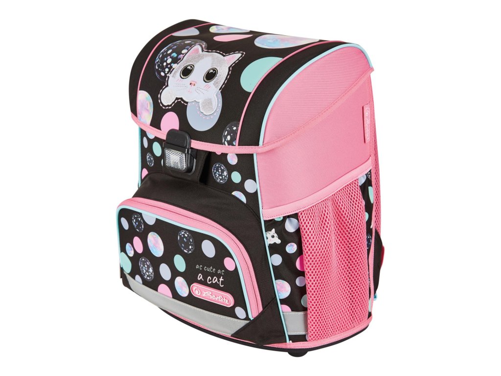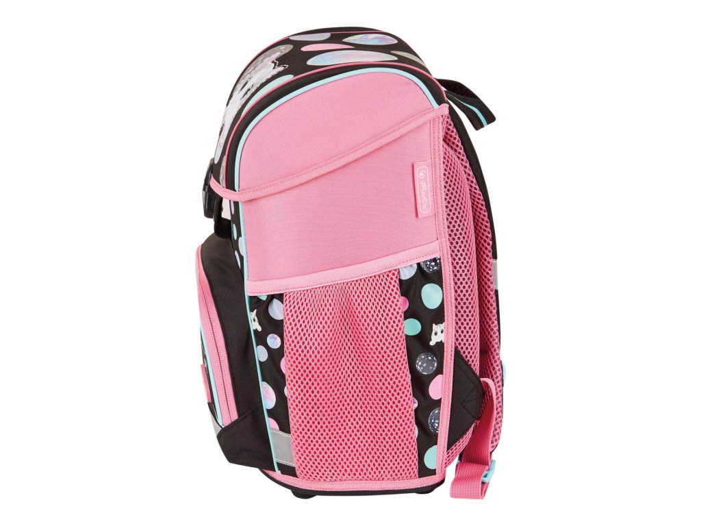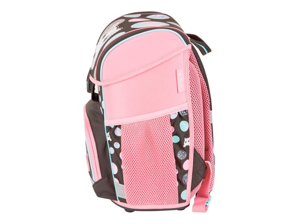 Školská taška s výbavou, ergonomicky tvarovaným a priedušným polstrovaním chrbta, nastaviteľnými ramennými popruhmi, výškovo nastaviteľným hrudným pásom, hlavným vreckom s priestorom na knihy, bočnými vreckami s elastickými pásikmi, predným vreckom na zips, stabilnou spodnou doskou s nožičkami, pohodlnou rukoväťou a reflexnými prvkami Oralite. Hmotnosť 950 g, objem 16 l, rozmery 37 x 31 x 22 cm. Vode-odolná, bez PVC, výbava: peračník, vrecko na prezuvky, okrúhle puzdro. Certifikát ergonómie 2023 a 2025. Materiál: polyester.