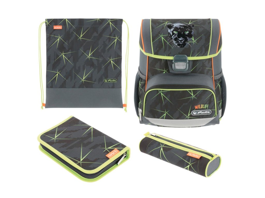 Školská taška s výbavou, ergonomicky tvarovaným a priedušným polstrovaním chrbta, nastaviteľnými ramennými popruhmi, výškovo nastaviteľným hrudným pásom, hlavným vreckom s priestorom na knihy, bočnými vreckami s elastickými pásikmi, predným vreckom na zips, stabilnou spodnou doskou s nožičkami, pohodlnou rukoväťou a reflexnými prvkami Oralite. Hmotnosť 950 g, objem 16 l, rozmery 37 x 31 x 22 cm. Vode-odolná, bez PVC, výbava: peračník, vrecko na prezuvky, okrúhle puzdro. Certifikát ergonómie 2023 a 2025. Materiál: polyester.