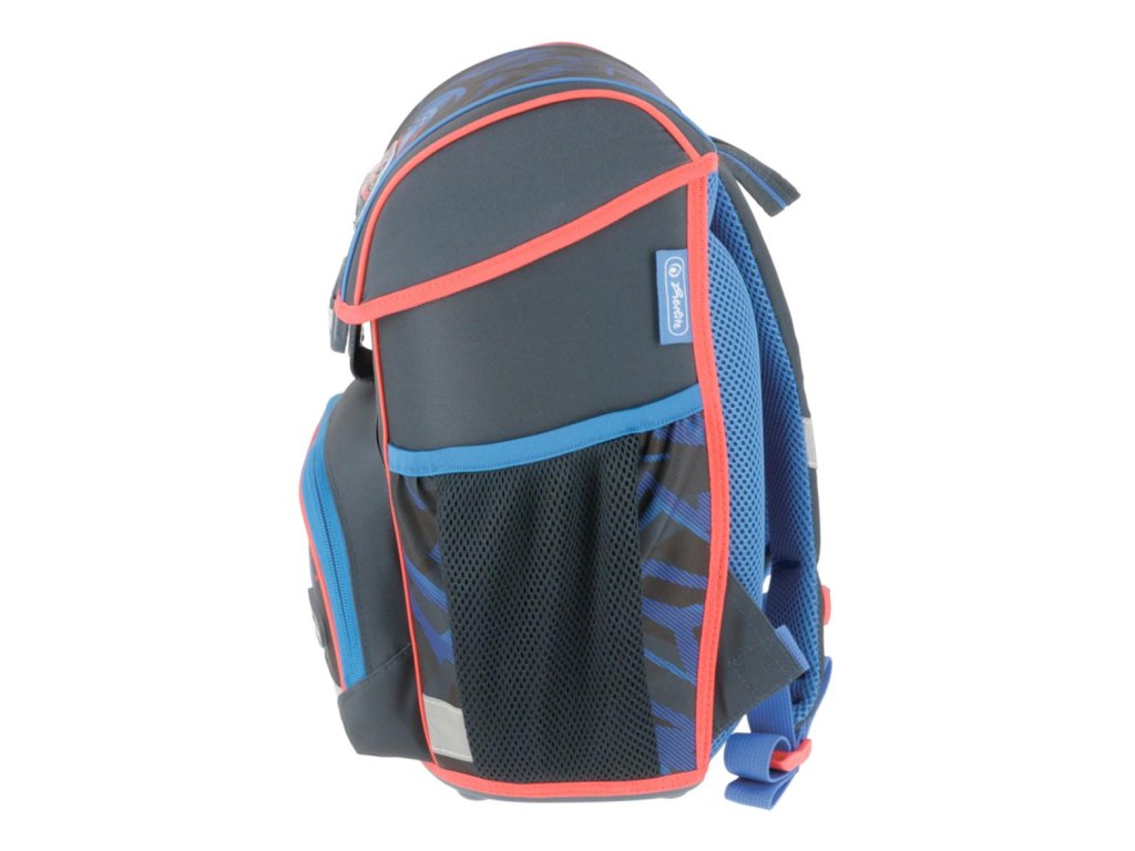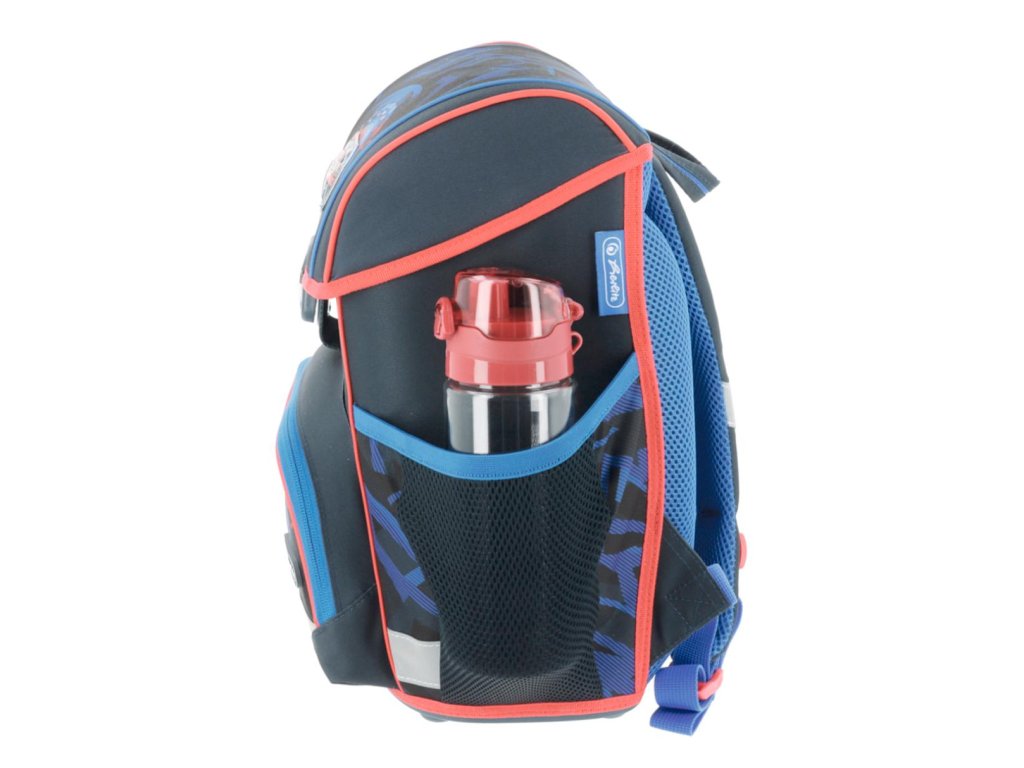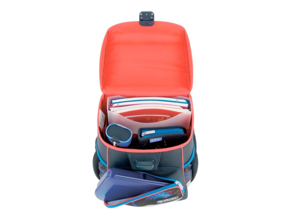 Školská taška s výbavou, ergonomicky tvarovaným a priedušným polstrovaním chrbta, nastaviteľnými ramennými popruhmi, výškovo nastaviteľným hrudným pásom, hlavným vreckom s priestorom na knihy, bočnými vreckami s elastickými pásikmi, predným vreckom na zips, stabilnou spodnou doskou s nožičkami, pohodlnou rukoväťou a reflexnými prvkami Oralite. Hmotnosť 950 g, objem 16 l, rozmery 37 x 31 x 22 cm. Vode-odolná, bez PVC, výbava: peračník, vrecko na prezuvky, okrúhle puzdro. Certifikát ergonómie 2023 a 2025. Materiál: polyester.
