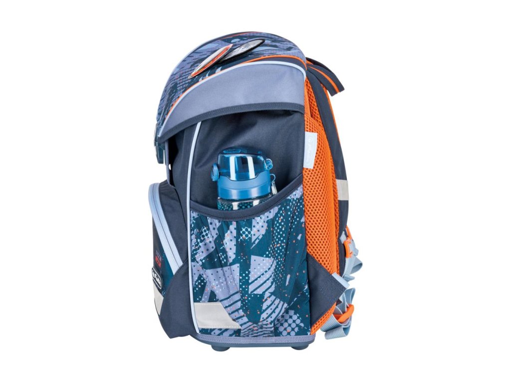 Školská taška bez výbavy, s anatomicky tvarovaným polstrovaným chrbtom, širokými nastaviteľnými ramennými popruhmi, hrudným popruhom, predným vreckom, dvomi bočnými vreckami, reflexnými prvkami Oralite, 1x aplikácia na suchý zips, 1 x dekoratívny prvok. Hmotnosť 750 g, objem 15 l, rozmery: 36 x 28 x 21 cm.