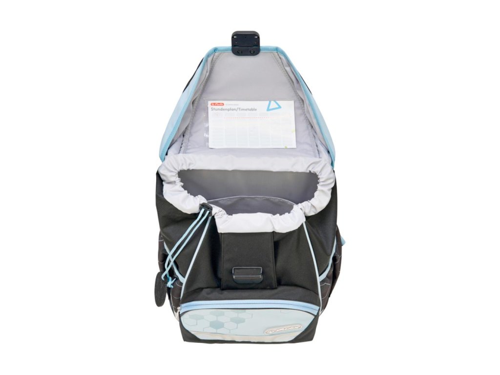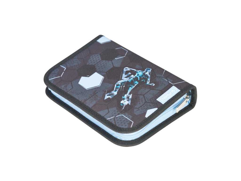 Školská taška s výbavou, s anatomicky tvarovaným polstrovaným a priedušným chrbtom, nastaviteľnými ramennými popruhmi, predným vreckom na zips, dvomi bočnými vreckami s elastickými pásikmi, stabilnou spodná doskou s nožičkami, pohodlnou rukoväťou, reflexnými prvkami Oralite, zatváranie Click lock zips, 1 x odnímateľný odznačik na suchý zips, 1 x dekoratívny prvok. Hmotnosť 800 g, objem 22 l, rozmery: 39 x 32 x 25 cm. Vode-odolná, bez PVC, výbava: peračník prázdny 2 chlopne, vrecko na prezuvky, oválne puzdro.