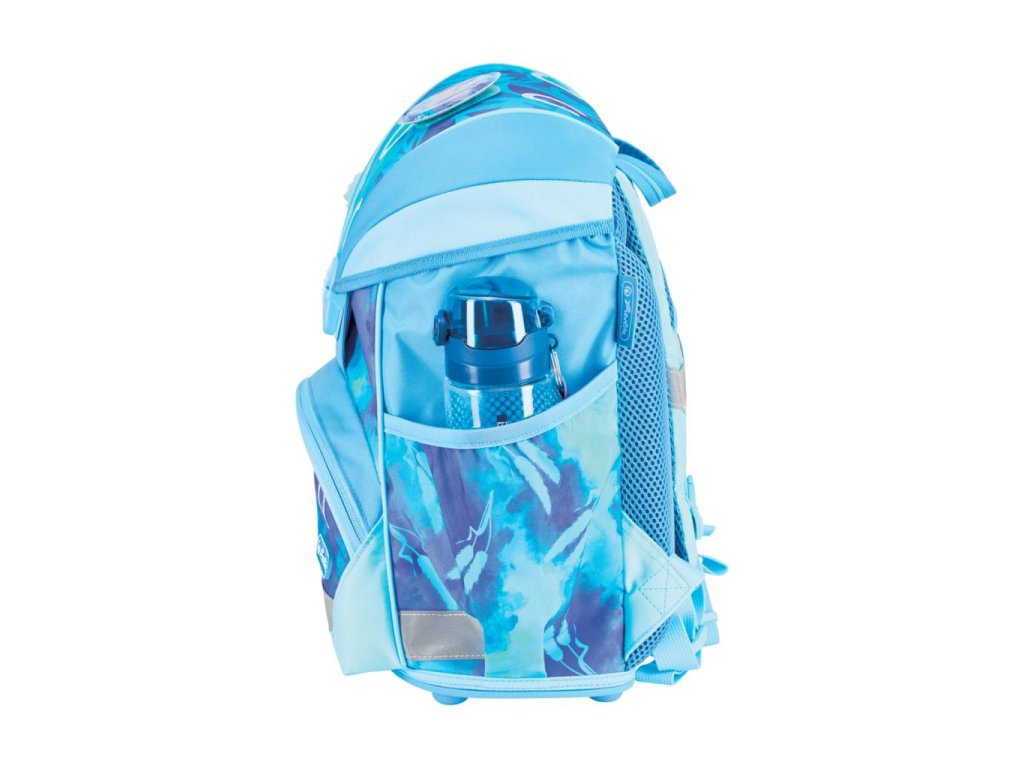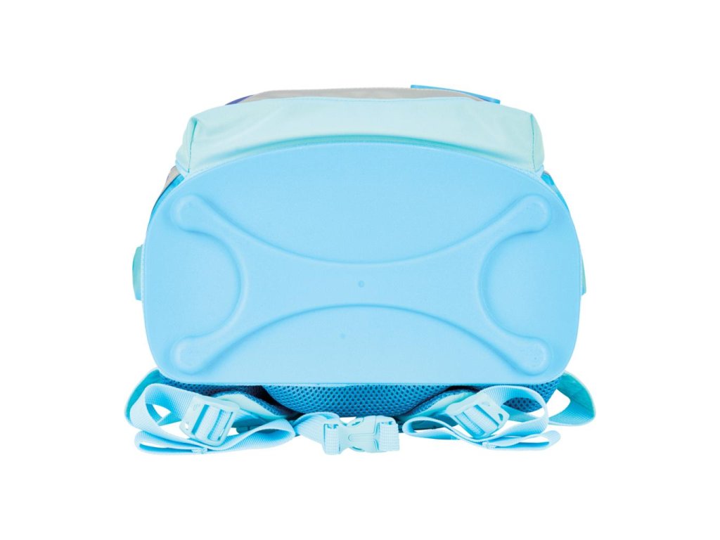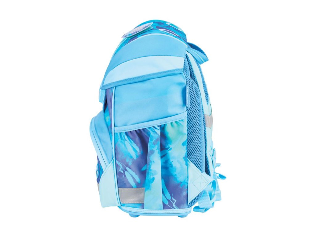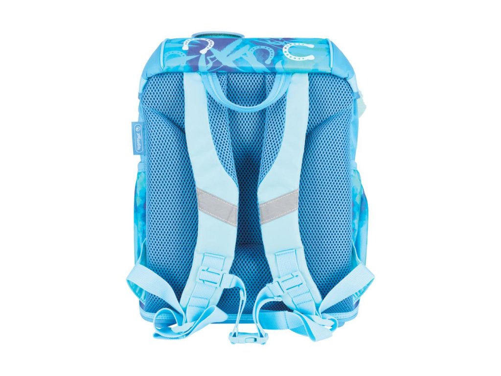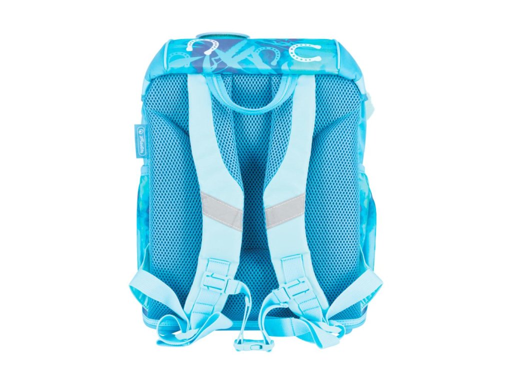 Školská taška s výbavou, s anatomicky tvarovaným polstrovaným a priedušným chrbtom, nastaviteľnými ramennými popruhmi, predným vreckom na zips, dvomi bočnými vreckami s elastickými pásikmi, stabilnou spodná doskou s nožičkami, pohodlnou rukoväťou, reflexnými prvkami Oralite, zatváranie Click lock zips, 1 x odnímateľný odznačik na suchý zips, 1 x dekoratívny prvok. Hmotnosť 800 g, objem 22 l, rozmery: 39 x 32 x 25 cm. Vode-odolná, bez PVC, výbava: peračník prázdny 2 chlopne, vrecko na prezuvky, oválne puzdro.