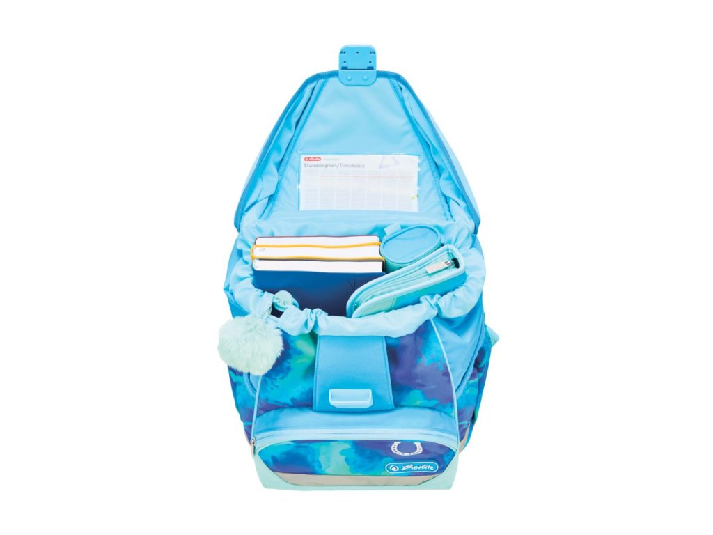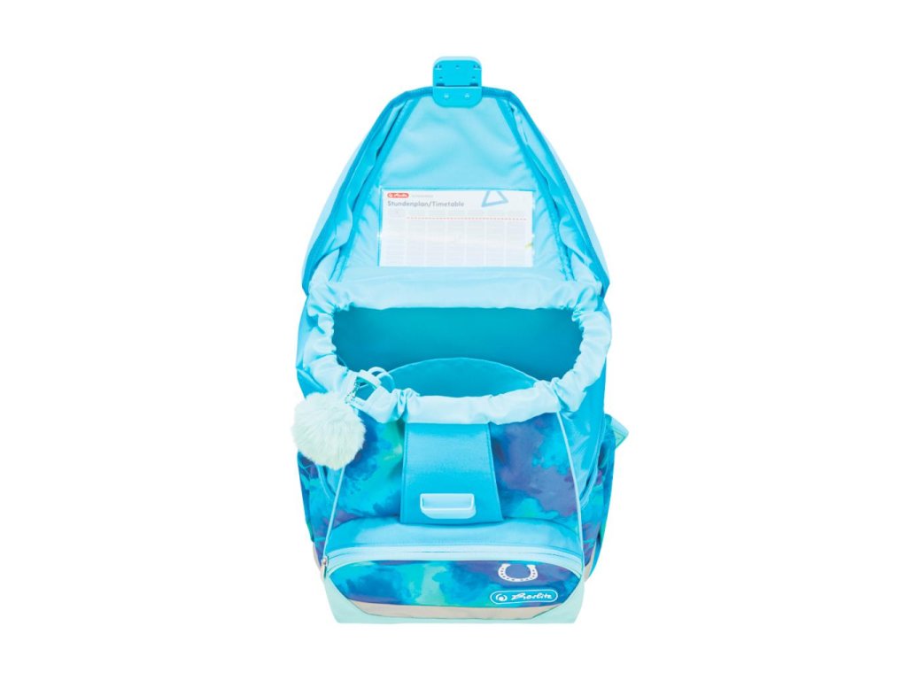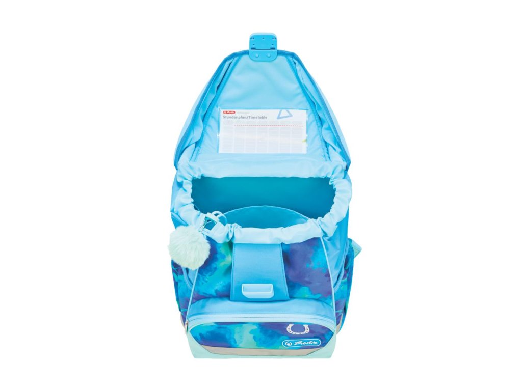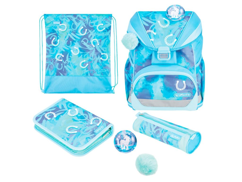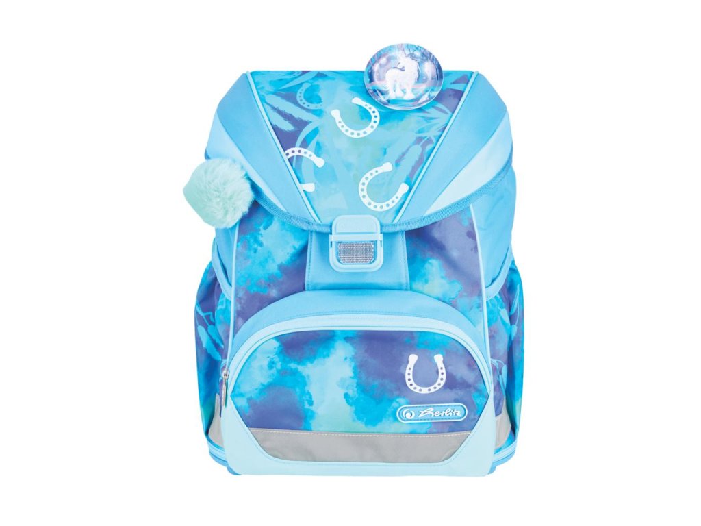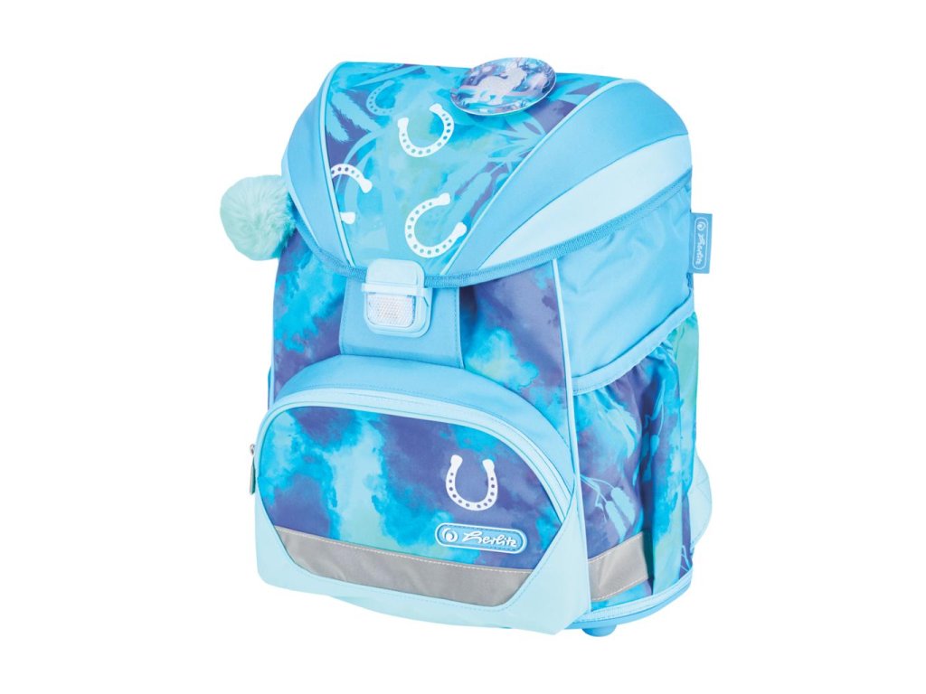 Školská taška s výbavou, s anatomicky tvarovaným polstrovaným a priedušným chrbtom, nastaviteľnými ramennými popruhmi, predným vreckom na zips, dvomi bočnými vreckami s elastickými pásikmi, stabilnou spodná doskou s nožičkami, pohodlnou rukoväťou, reflexnými prvkami Oralite, zatváranie Click lock zips, 1 x odnímateľný odznačik na suchý zips, 1 x dekoratívny prvok. Hmotnosť 800 g, objem 22 l, rozmery: 39 x 32 x 25 cm. Vode-odolná, bez PVC, výbava: peračník prázdny 2 chlopne, vrecko na prezuvky, oválne puzdro.