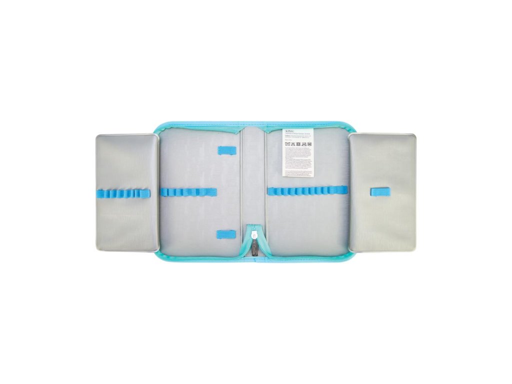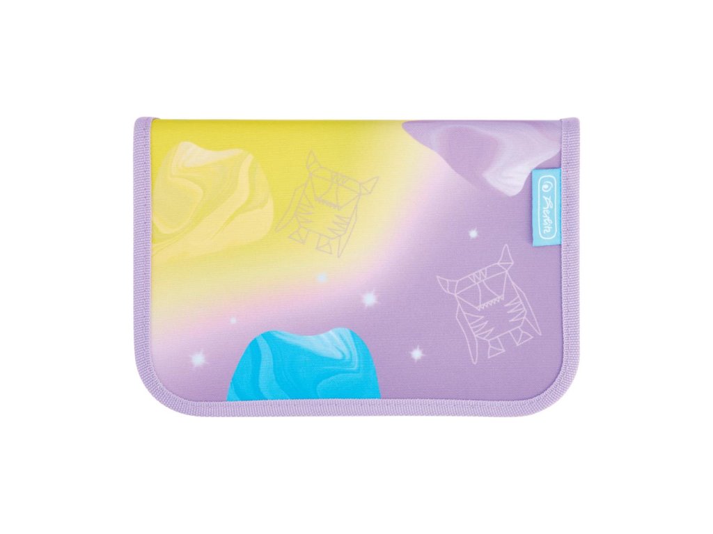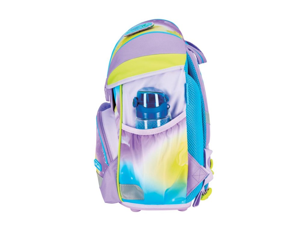 Školská taška s výbavou, s anatomicky tvarovaným polstrovaným a priedušným chrbtom, nastaviteľnými ramennými popruhmi, predným vreckom na zips, dvomi bočnými vreckami s elastickými pásikmi, stabilnou spodná doskou s nožičkami, pohodlnou rukoväťou, reflexnými prvkami Oralite, zatváranie Click lock zips, 1 x odnímateľný odznačik na suchý zips, 1 x dekoratívny prvok. Hmotnosť 800 g, objem 22 l, rozmery: 39 x 32 x 25 cm. Vode-odolná, bez PVC, výbava: peračník prázdny 2 chlopne, vrecko na prezuvky, oválne puzdro.