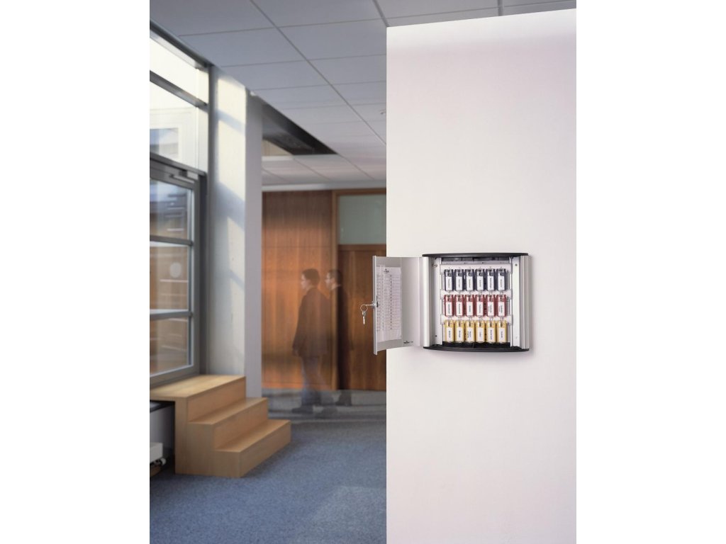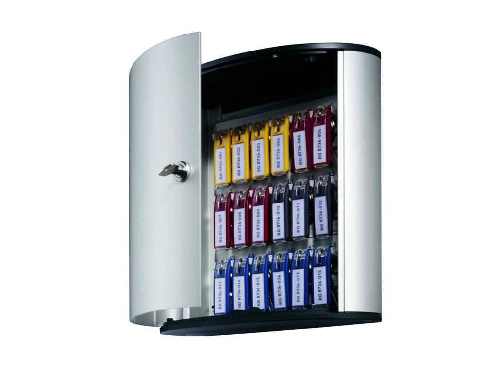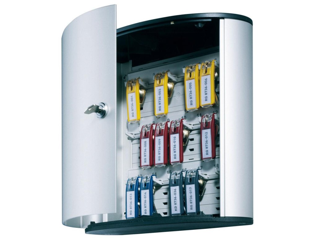 Skrinka na 18 kľúčov s dvierkami, otvárajúcimi sa z dôvodu lepšej obsluhy v 180° uhle. Jednoduchá montáž na stenu. Súčasťou balenia je montážna sada, 2 bezpečnostné kľúče a 6 menoviek na kľúče v rôznych farbách. Farba strieborná.