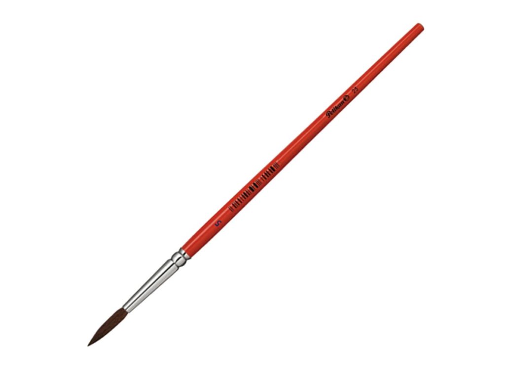 Guľatý vlasový štetec Pelikan 23, štandarndá kvalita, s hliníkovým úchytom, oranžová lakovaná rukoväť, hrúbka stopy uvedená ako číslo.