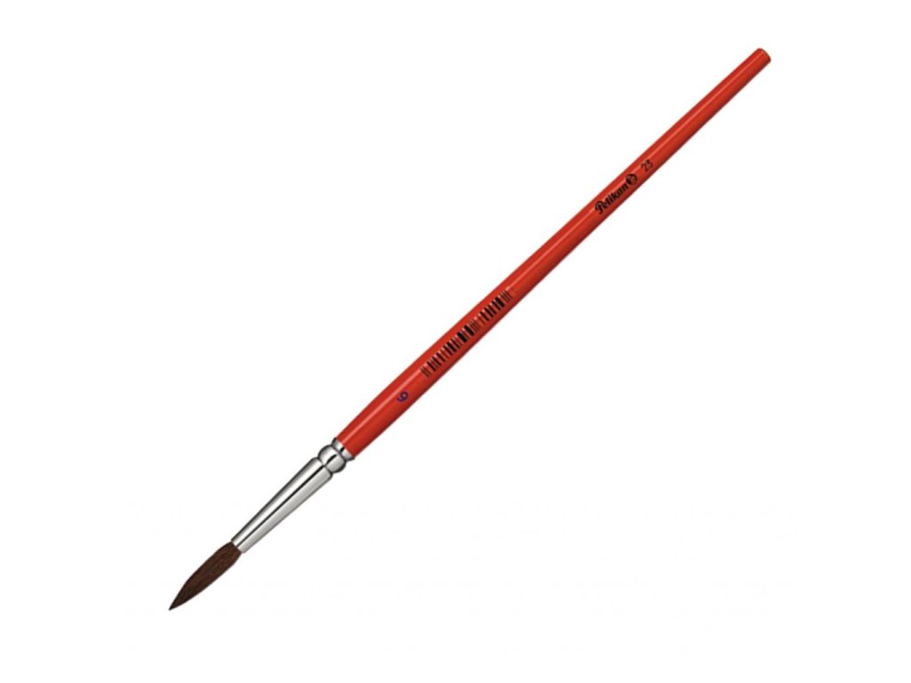 Guľatý vlasový štetec Pelikan 23, štandarndá kvalita, s hliníkovým úchytom, oranžová lakovaná rukoväť, hrúbka stopy uvedená ako číslo.