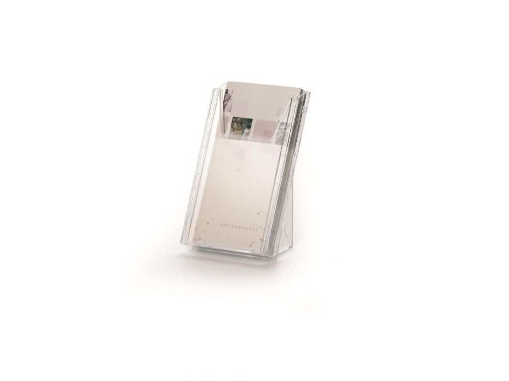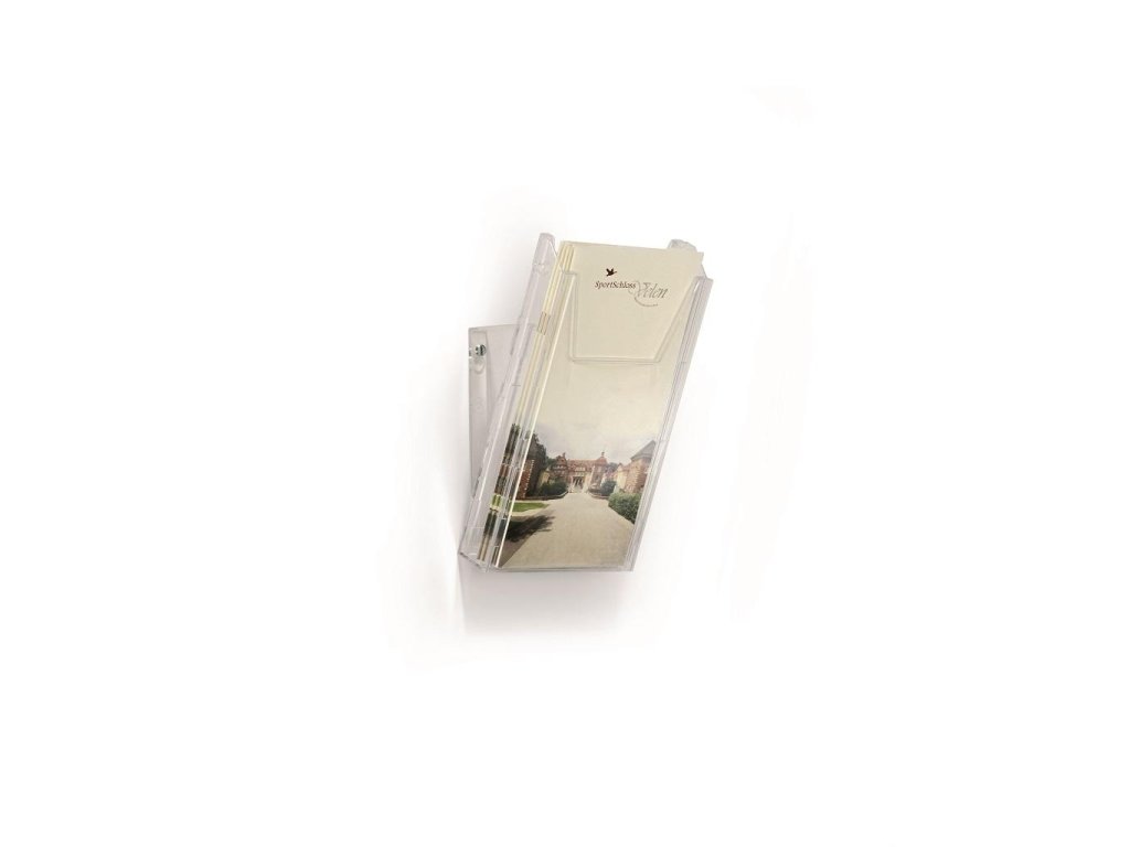 Kombinovaný stojan na prospekty a časopisy formátu DL a A6 s jedným odkladačom a závesným dielom na stenu, resp. stôl. Naplnenie materiálmi do hrúbky 24 mm. Materiál priehľadný plast.