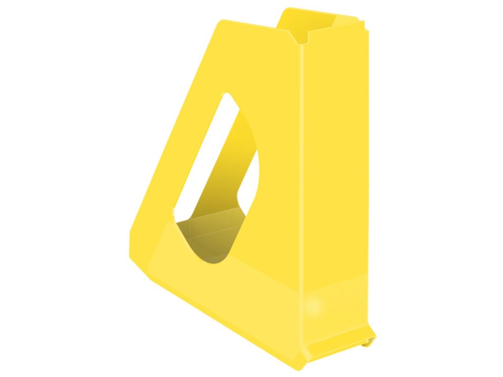 Moderný stojan na časopisy pre uloženie dokumentov formátu A4 na pracovnom stole s unikátnym embosovaným povrchom (štvorčeky) na dne stojana vo sviežich farbách radu Esselte VIVIDA. Znížený chrbát pre jasnú identifikáciu obsahu z prednej strany, integrovaný úchyt pre ľahké vytiahnutie z police. Farba žltá. Rozmery (š x v x h) 72 x 256 x 260 mm. Je možné kombinovať ho s ostatnými výrobkami z radu Esselte Europost a VIVIDA pre jednotný vzhľad kancelárie.