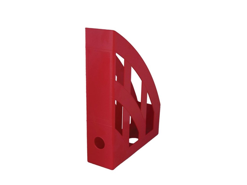 Plastový stojan na časopisy zaoblený dizajn - odolný materiál, miesto na etiketu na chrbte. Farba červená.