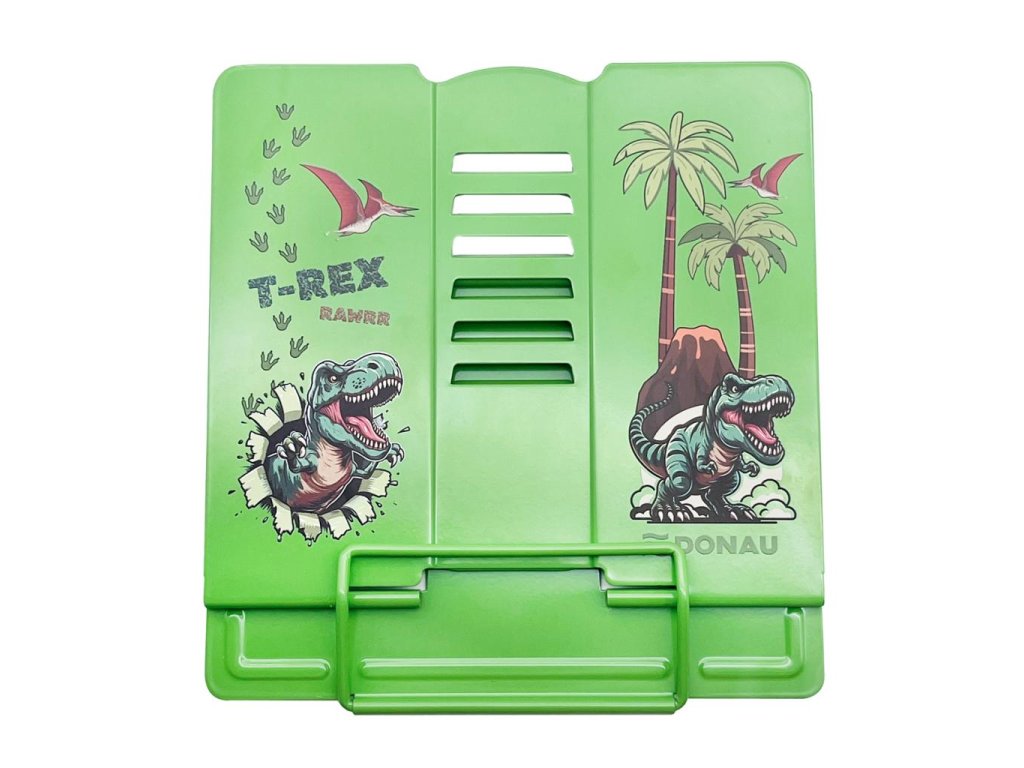 Kvalitný stojan na knihy, učebnice alebo tablet s atraktívnou potlačou Dino T-Rex. Vyrobený z odolného lakovaného kovu, ideálny aj pre ťažšie knihy. S protišmykovými úchytmi, nastaviteľná výška a uhol sklonu v 5 stupňoch. Keď sa nepoužíva, zloží sa úplne naplocho. Súčasťou je aj praktická zarážka na otvorenú stránku. Využitie nájde doma, v škole, v kuchyni, v kancelárii či ako stojan na noty. Rozmery: základňa: 21 × 16,5 cm, výška: 15,7 cm.