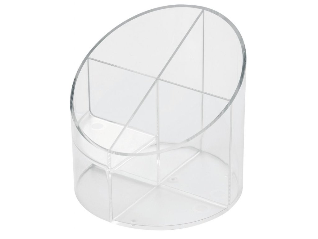 Stojan so štyrmi oddielmi na perá, ceruzky a kancelárske drobnosti z plastu v ekonomickom prevedení. Výška 105 mm, priemer 110 mm. Farba priehľadná číra.