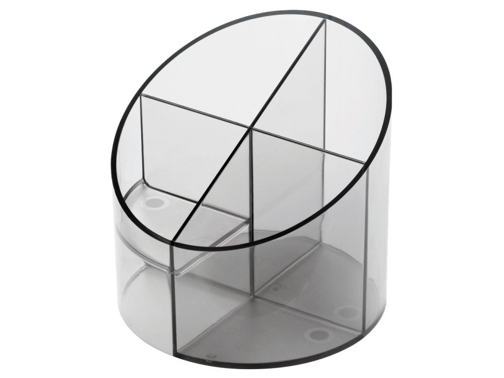 Stojan so štyrmi oddielmi na perá, ceruzky a kancelárske drobnosti z plastu v ekonomickom prevedení. Výška 105 mm, priemer 110 mm. Farba priehľadná dymová.