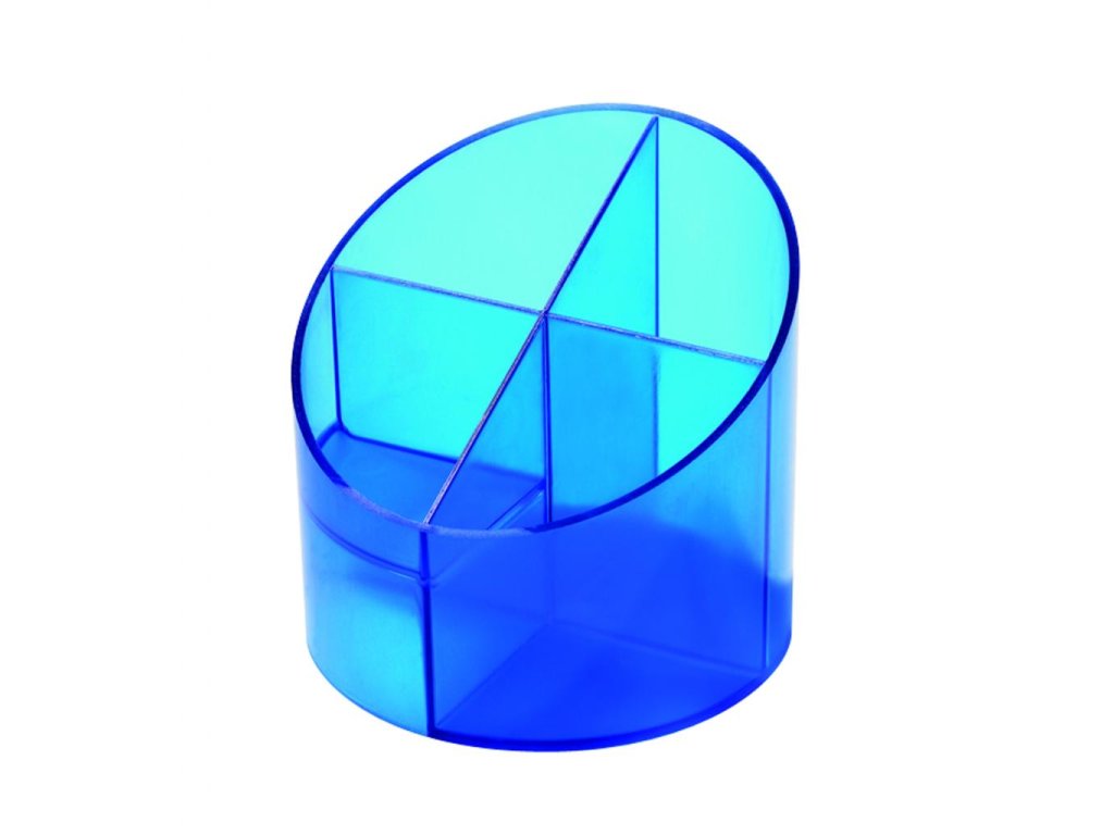 Stojan so štyrmi oddielmi na perá, ceruzky a kancelárske drobnosti z plastu v ekonomickom prevedení. Výška 105 mm, priemer 110 mm. Farba priehľadná modrá.