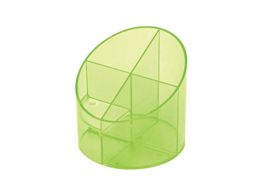 Stojan so štyrmi oddielmi na perá, ceruzky a kancelárske drobnosti z plastu v ekonomickom prevedení. Výška 105 mm, priemer 110 mm. Farba priehľadná zelená.