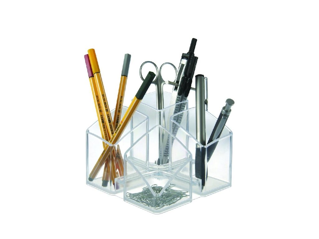 Stojan so 4 sekciami na písacie potreby a ďalšie kancelárske drobnosti. Spodná strana s protišmykovou úpravou. Materiál kvalitný plast vysokého lesku. Pri spojení 2 alebo 4 stojanov dosiahnete zaujímový moderný efekt. Rozmery 125 × 125 × 100 mm. Stojan dodávaný prázdny.