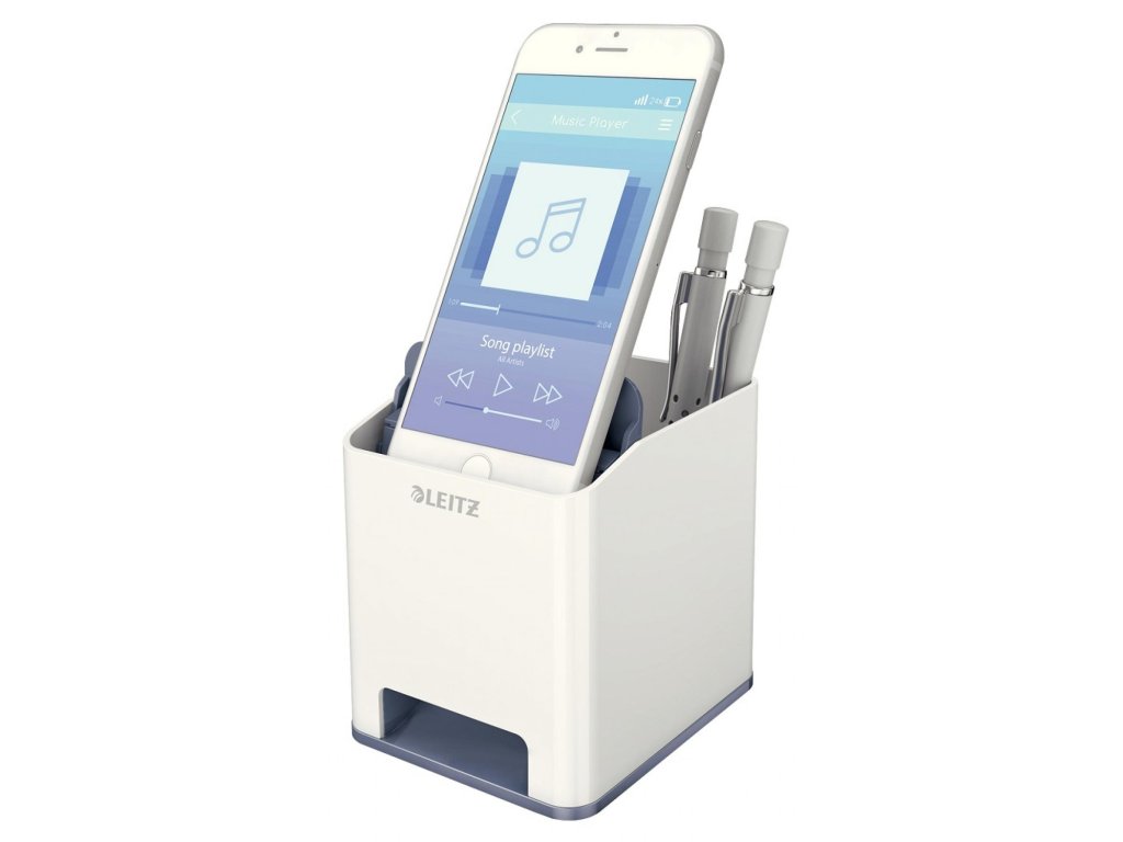 Neprehliadnuteľný štýlový stojan na perá v prémiovej kvalite Leitz v štýlových žiarivých farbách WOW. Extra odkladač pre smartphone do veľkosti iPhone 6 plus so špeciálnou funkciou pre zosilovanie zvuku, veľa miesta pre písacie potreby, pravítko, stylus a iné drobnosti. Moderný dizajn, ktorý vyzerá rovnako dobre v kancelárii, ako aj doma na pracovnom stole, dobre dopĺňa ostatné produkty radu WOW.