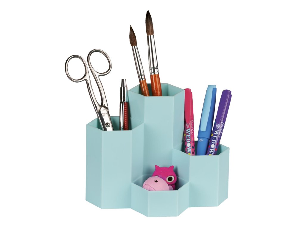 Stojan na perá so šesťuholníkovými trubicami je vyrobený z mimoriadne odolného a nárazuvzdorného polypropylénu. Vďaka tvaru včelieho plástu ho možno zoskupiť, aby sa ušetrilo miesto. 4 trubice, usporiadané v rôznych výškach, ponúkajú voľný priestor na pravítka, štetce, nožnice, perá a samozrejme aj na menšie predmety na stole, ako sú strúhadlá a gumy.