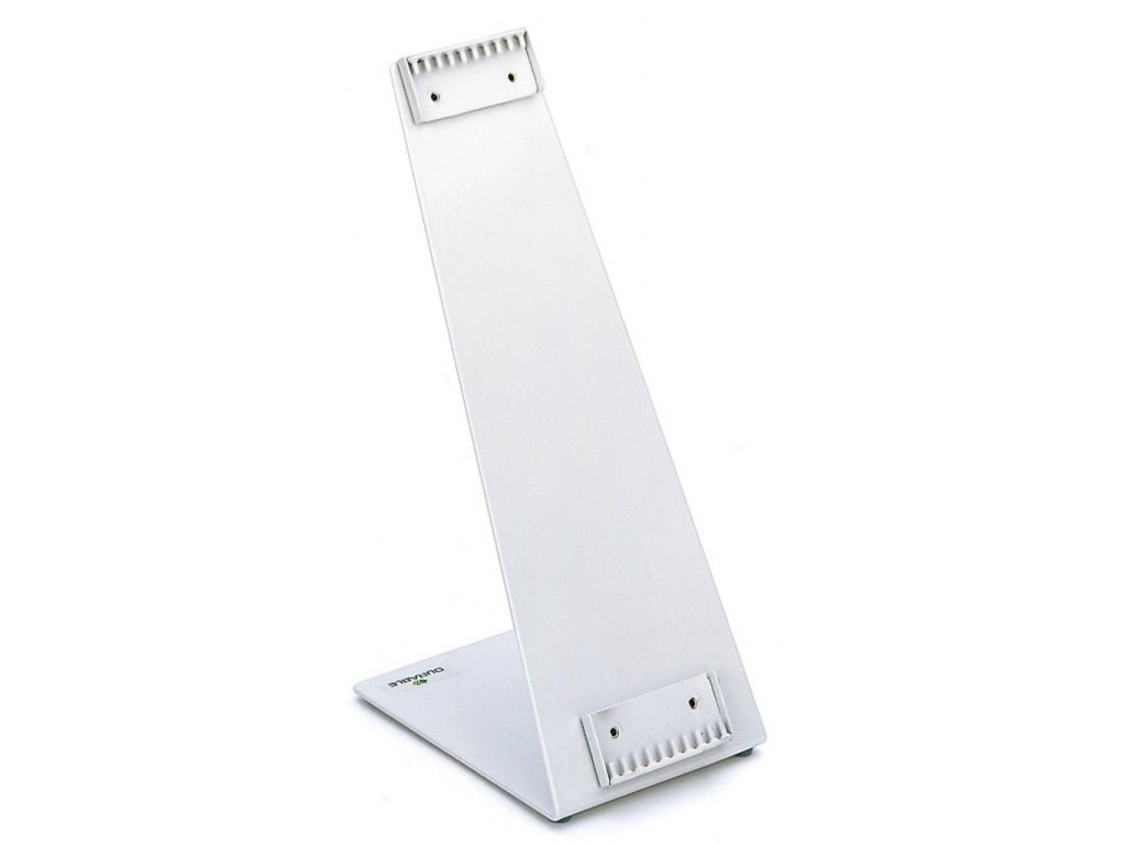 Extrémne pevný odľahčený kovový stojan v tvare L. Plastový poťah odolný voči oderu. Dodávaný prázdny s kapacitou na 10 panelov. Farba sivá.