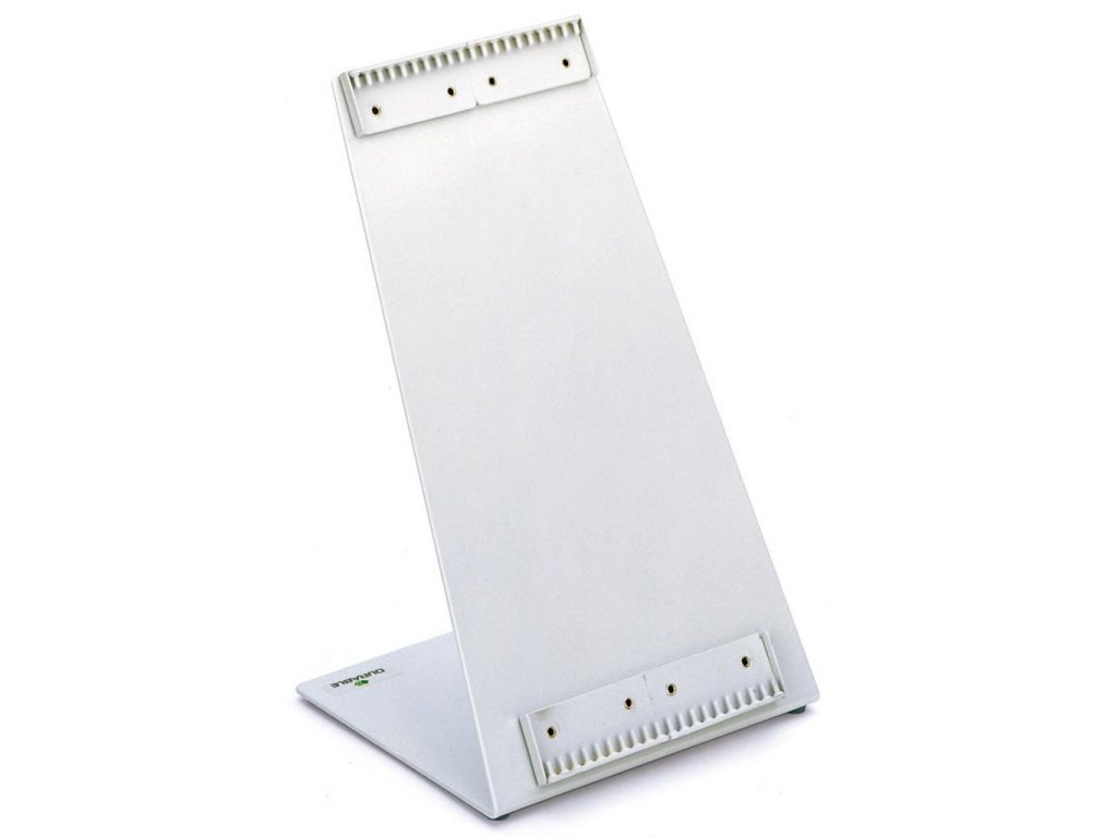 Extrémne pevný odľahčený kovový stojan v tvare L. Plastový poťah odolný voči oderu. Dodávaný prázdny s kapacitou na 20 panelov. Farba sivá.