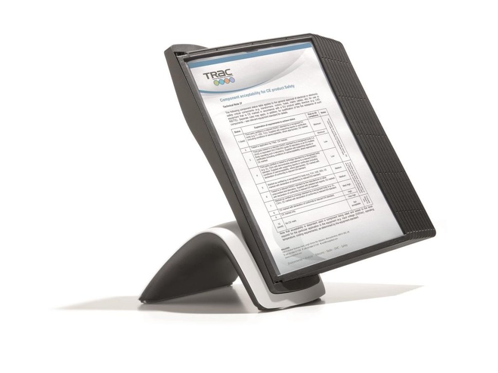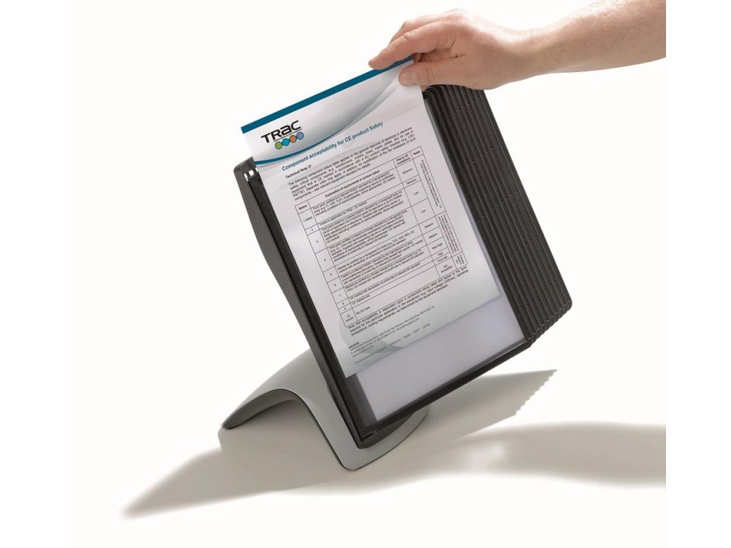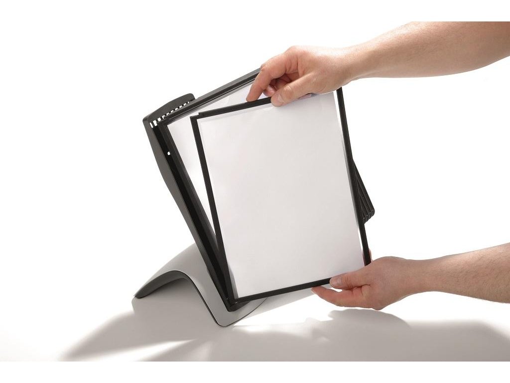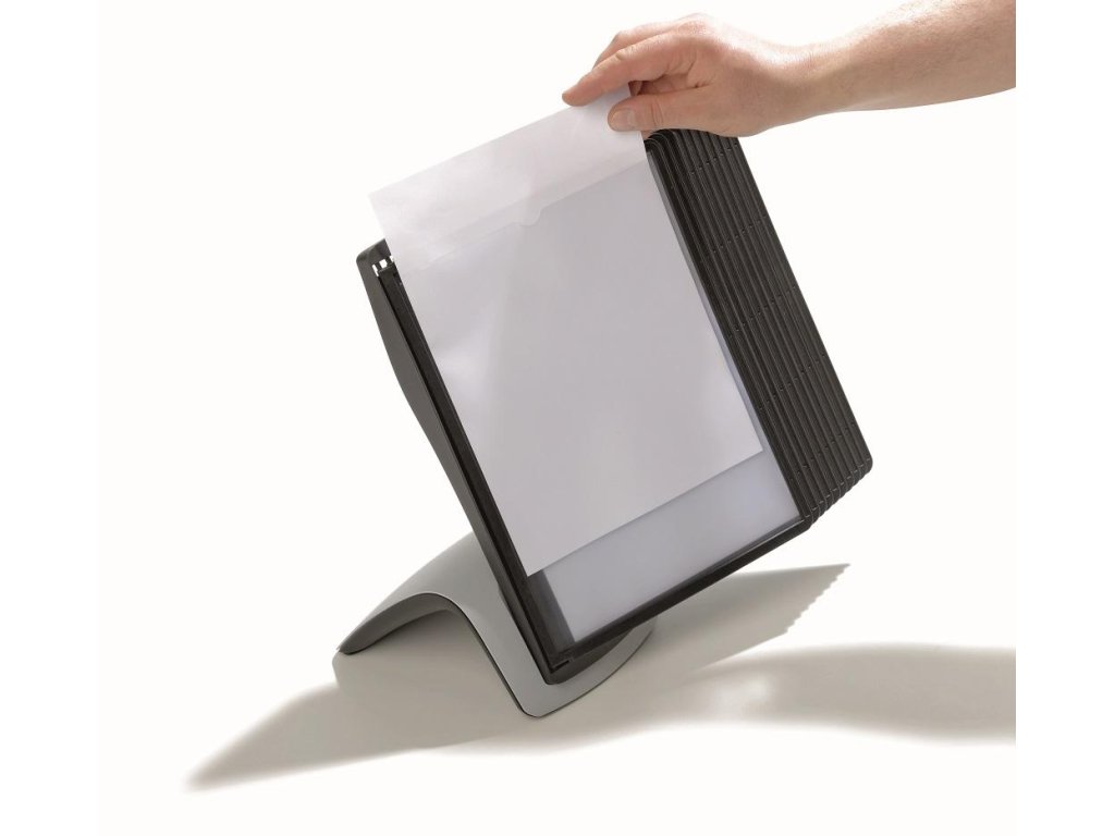 Štýlový stojan na stôl dodávaný s 10 displejovými panelmi SHERPA a indexami. Ideálny do kancelárií a na verejne prístupné miesta. Otvor na hornej strane panelu zabezpečuje jednoduché vkladanie a v prípade potreby rýchlu výmenu vložených materiálov. Farba panelov čierna.