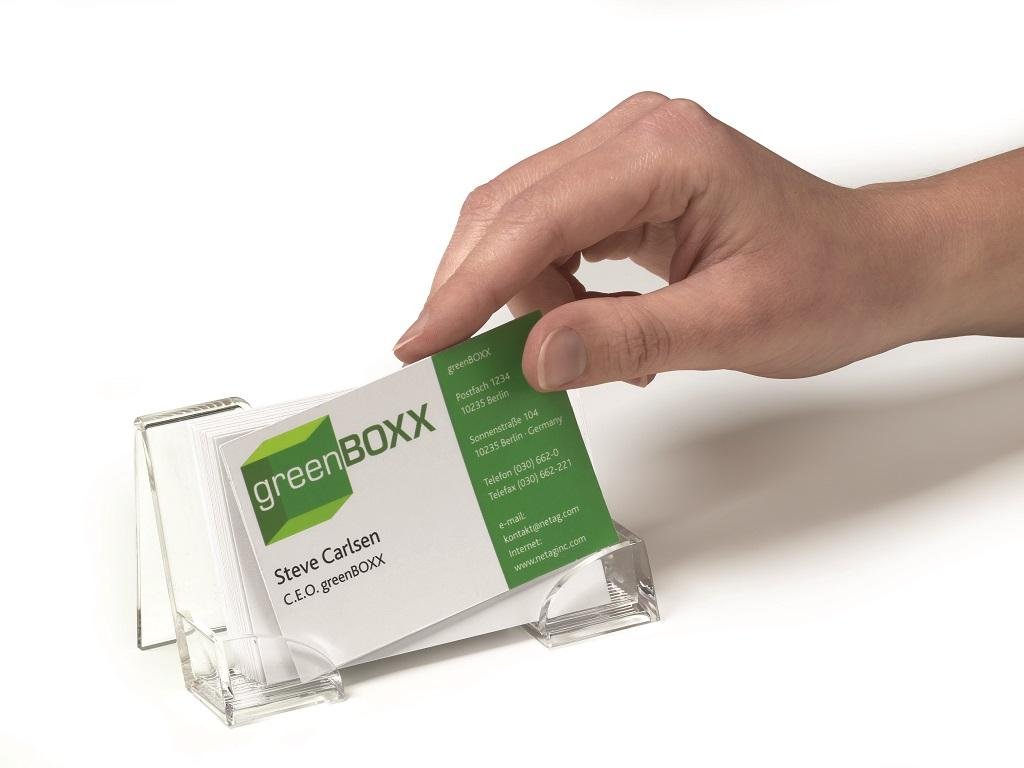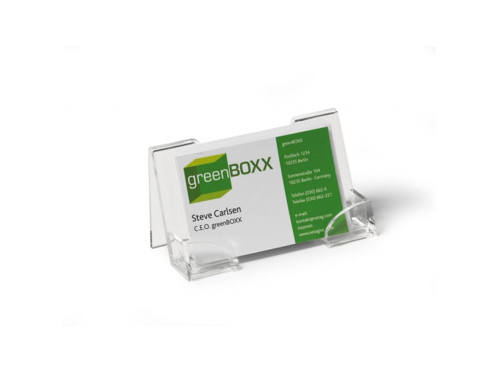 Jednoduchý a zároveň štýlový stolový stojan na vizitky. Dodávaný so samolepiacimi protišmykovými podložkami. Kapacita 50 vizitiek maximálnej šírky 100 mm. Farba číra.