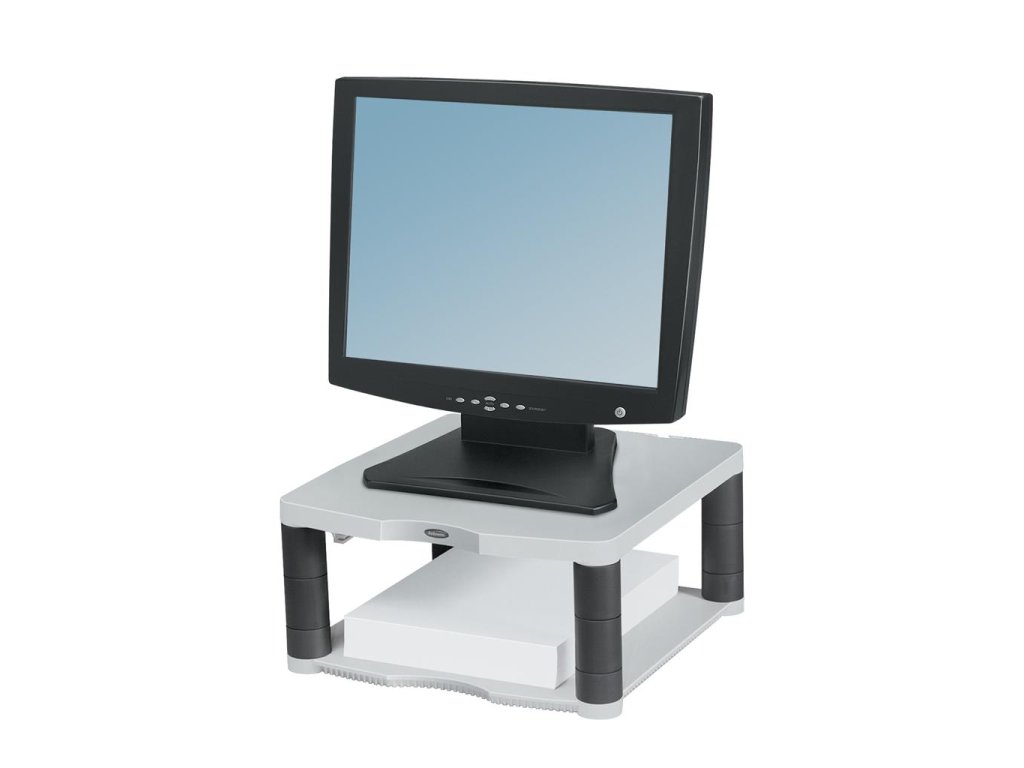 Model nastaviteľný v piatich výškových stupňoch, vhodný pre 13 - 17 palcové monitory. Rozmery 333 × 343 × 63 - 165 mm, nosnosť 27 kg. Farba platinová.