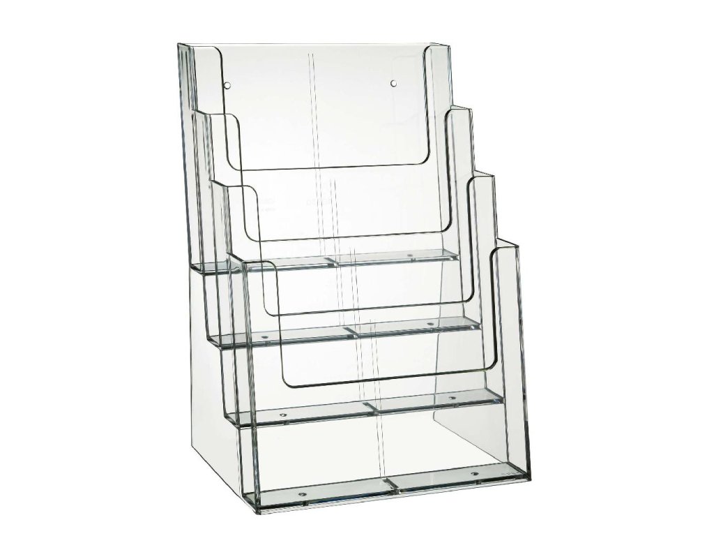 Stojan na prospekty formátu A4 so štyrmi oddielmi. Materiál priehľadný číry plast. Rozmery (š x v x h) 230 x 345 x 170 mm.
