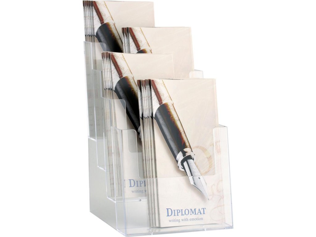 Stojan na prospekty formátu A5 so štyrmi oddielmi. Materiál priehľadný číry plast. Rozmery (š x v x h) 165 x 260 x 155 mm.