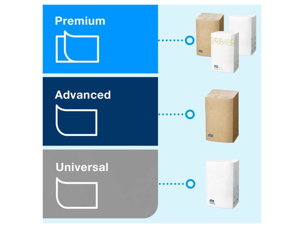 Dvojvrstvové univerzálne jemné utierky prémiovej kvality z celulózy. Utierky sú vhodné do Tork Xpress® zásobníka systému H2 na papierové utierky Multifold v stredne frekventovaných toaletách a umyvárňach. Možno ho použiť do malých priestorov a vašim hosťom poskytuje pohodlie aj hygienu.