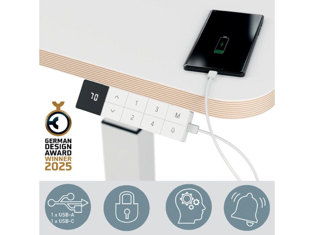 Jednoduchá manipulácia vďaka slúchadlu so 4 pamäťovými funkciami, pripomenutie státia, antikolizná a detská poistka, ochrana proti prehriatiu, 5V USB-C a USB port, obrazovka s výškou displeja)