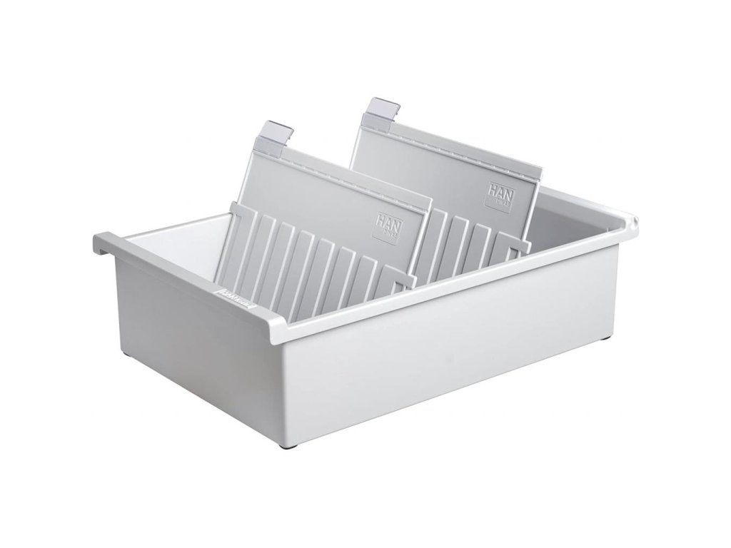 Kartotéka z antistatického nárazuvzdorného plastu na 1000 kartičiek ukladaných horizontálne. Vybavená dvoma plastovými oddeľovačmi, (inak prázdna) a ochrannými plstenými podložkami. Dodávaná bez vrchného krytu. br />Formát karty: A5