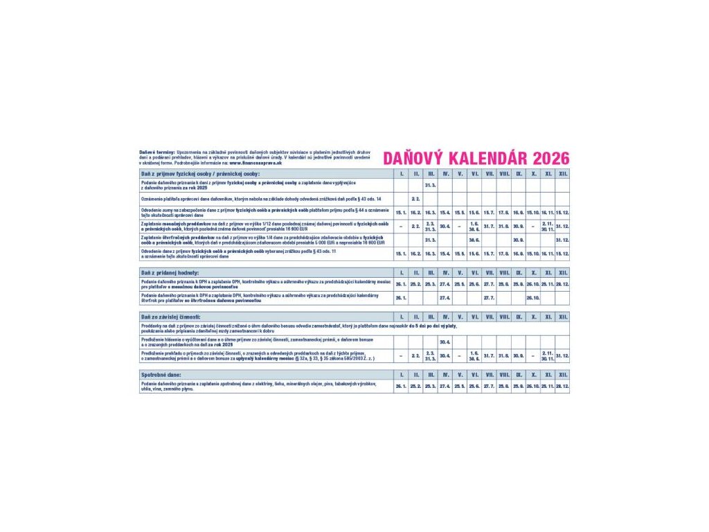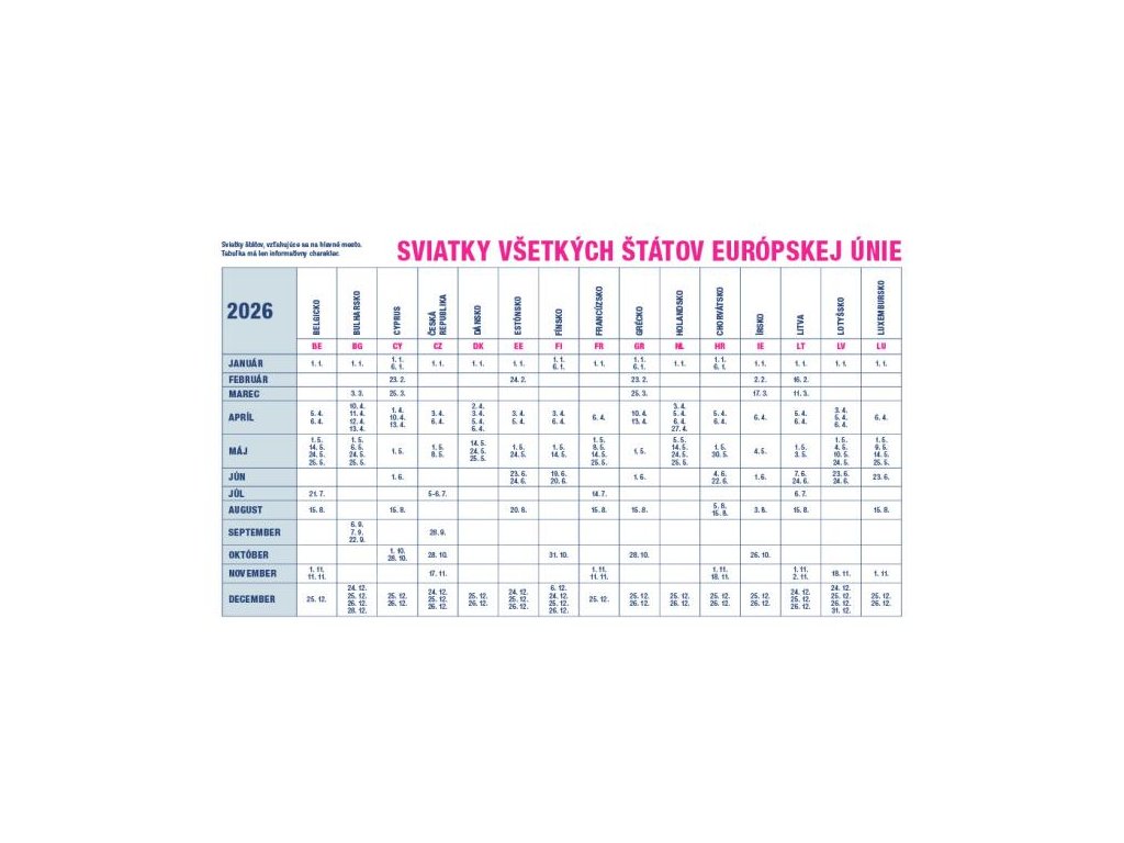Pracovný týždenný kalendár. Stĺpcové kalendárium. Obsahuje dane, fond pracovného času, sviatky v EU, východy a západy slnka, fázy mesiaca.