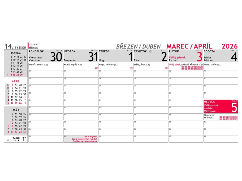 Praktický plánovací kalendár s prehľadom najbližších mesiacov na ľavej strane. Dostatok miesta na plánovanie celého týždňa. Obsahuje dane, fond pracovného času, sviatky v EU, východy a západy slnka, fázy mesiaca.