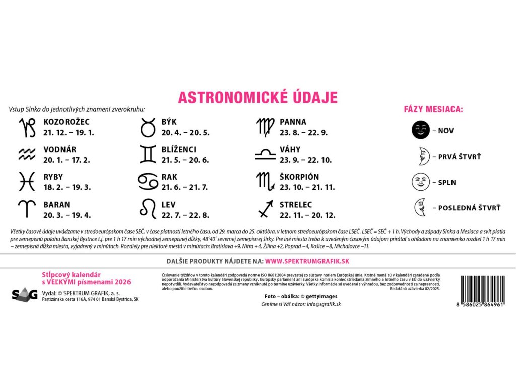 Stolový kalendár stĺpcový 29,7 x 13,8 cm s VEĽKÝMI písmenami 2026