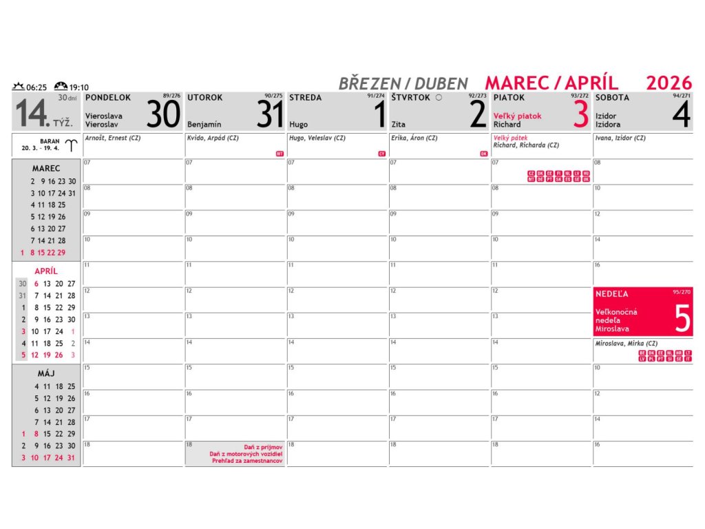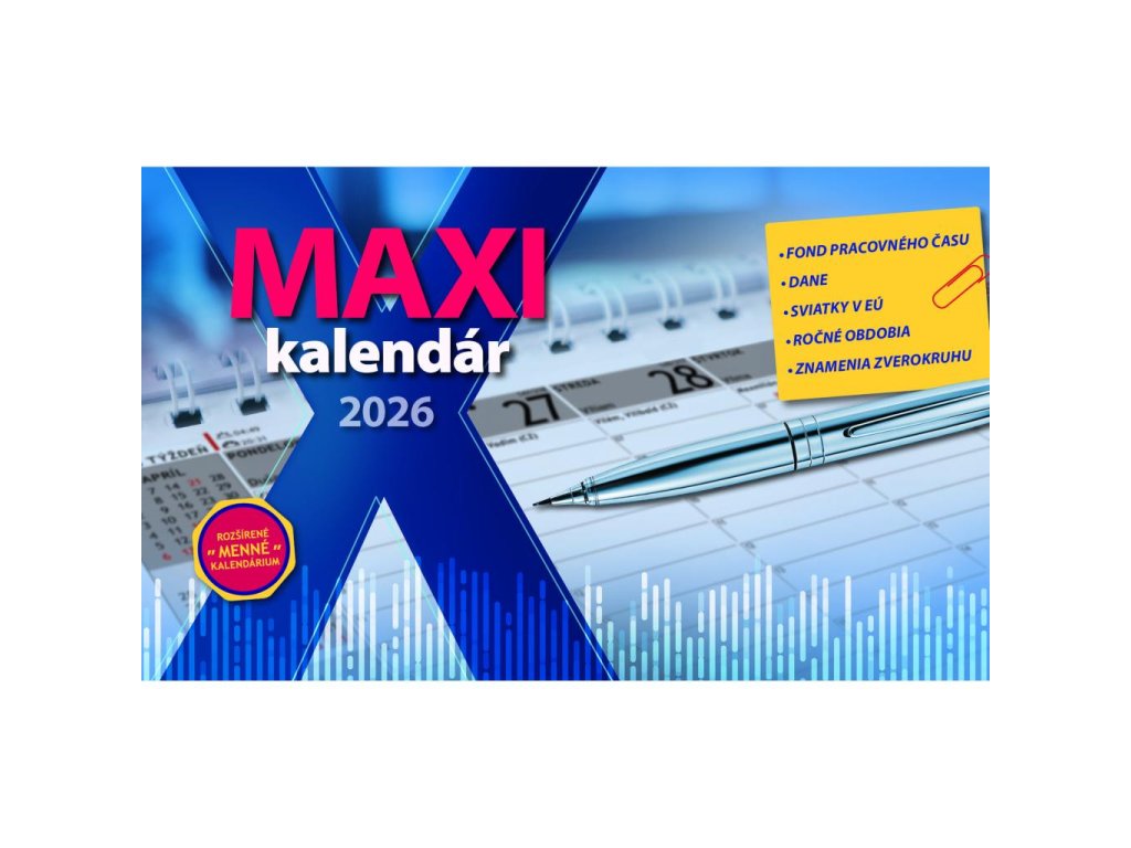 MAXI formát - maximálny prehľad pre váš čas a povinnosti. Tento prehľadný stolový kalendár vo väčšom formáte obsahuje: fond pracovného času pre jednoduché plánovanie, daňový kalendár so zvýraznenými termínmi, školský kalendár so začiatkami a koncami prázdnin, sviatky v EU, ročné obdobia, ročný prehľad na roky 2026 a 2027. Vďaka prehľadnému rozloženiu a veľkému priestoru na poznámky je ideálny pre kancelárie, podnikateľov, kde sa plánuje efektívne a s prehľadom.
